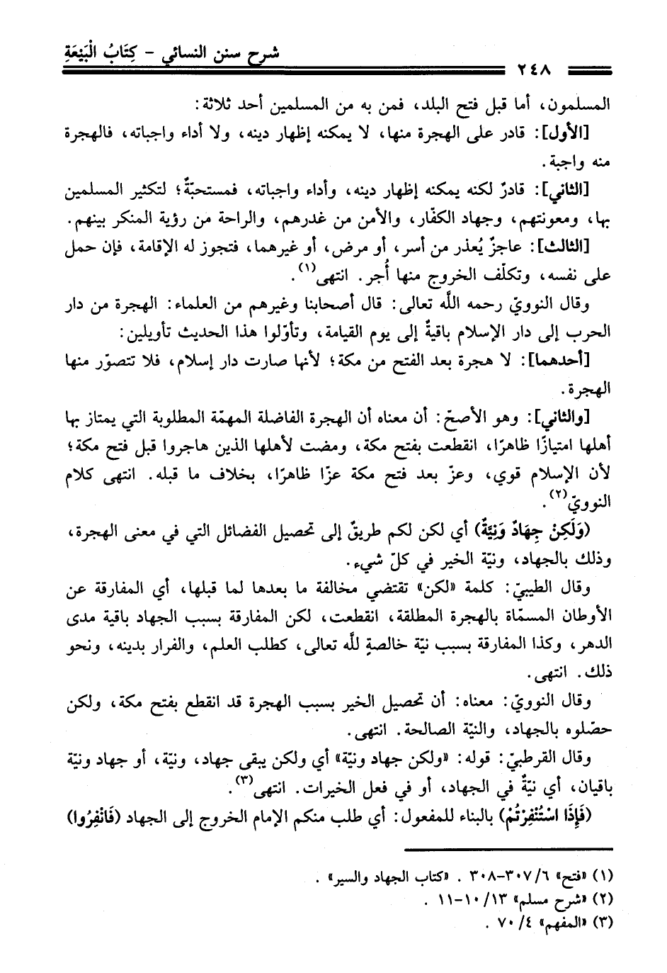 وَقَالَ النوويّ رحمه الله تعالى: قَالَ أصحابنا وغيرهم منْ العلماء: الهجرة منْ دار الحرب إلى دار الإِسلام باقية إلى يوم القيامة، وتأوّلوا هَذَا الحديث تأويلين: