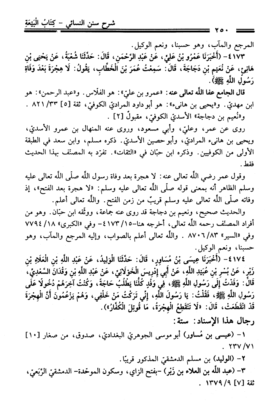 4173 - (أَخْبَرَنَا عَمْرُو بْنُ عَلِيٍّ، عَنْ عَبْدِ الرَّحْمَنِ، قَالَ: حَدَّثَنَا شُعْبَةُ، عَنْ يَحْيَى بْنِ هَانِىءٍ، عَنْ نُعَيْمِ بْنِ دِجَاجَةَ، قَالَ: سَمِعْتُ عُمَرَ بْنَ الْخَطَّابِ، يَقُولُ: لاَ هِجْرَةَ بَعْدَ وَفَاةِ رَسُولِ اللَّهِ -صلى الله عليه وسلم-).