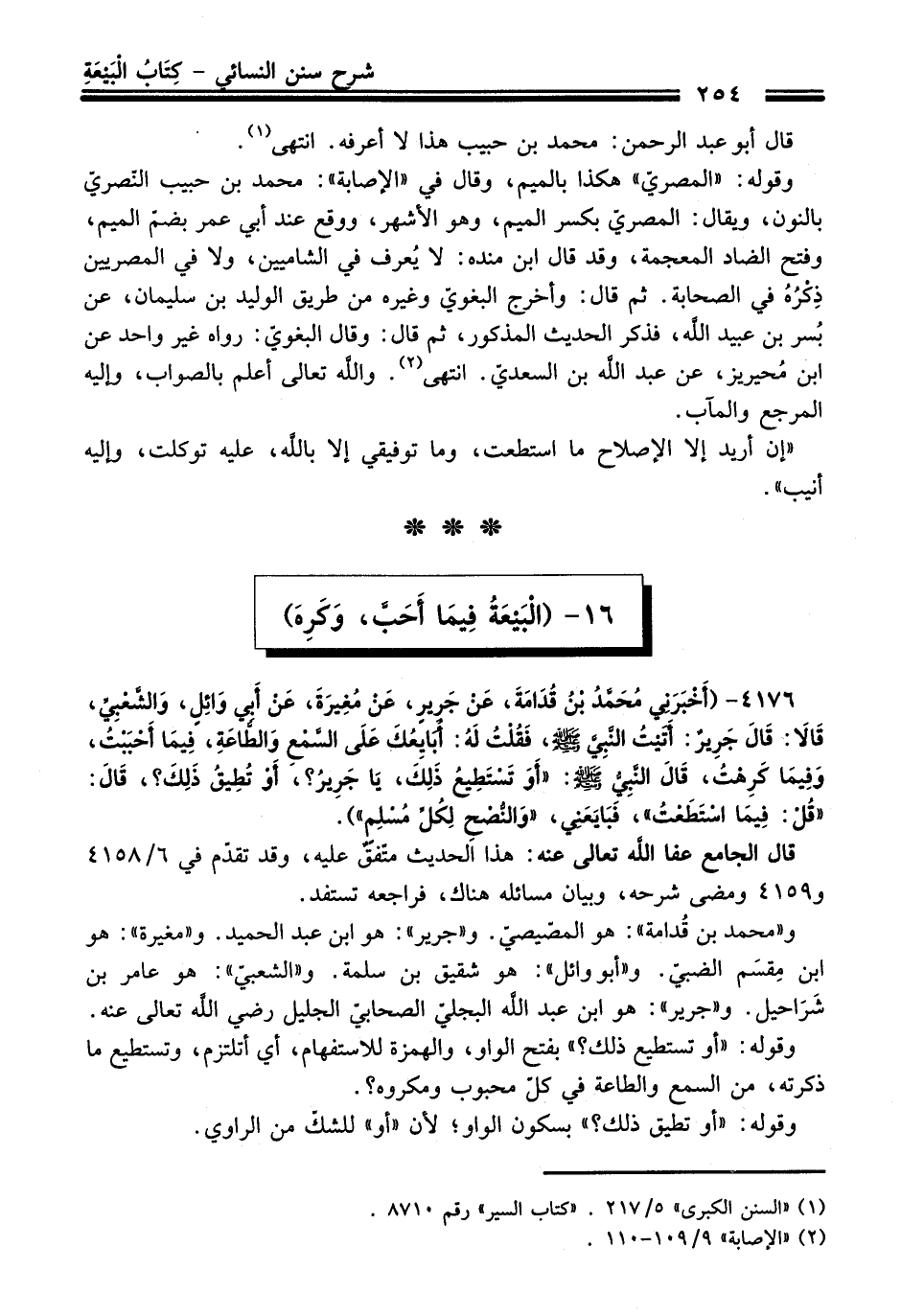 4176 - (أَخْبَرَنِي مُحَمَّدُ بْنُ قُدَامَةَ، عَنْ جَرِيرٍ، عَنْ مُغِيرَةَ، عَنْ أَبِي وَائِلٍ، وَالشَّعْبِيِّ، قَالاَ: قَالَ جَرِيرٌ: أَتَيْتُ النَّبِيَّ -صلى الله عليه وسلم- فَقُلْتُ لَهُ: أُبَايِعُكَ عَلَى السَّمْعِ وَالطَّاعَةِ، فِيمَا أَحْبَبْتُ، وَفِيمَا كَرِهْتُ، قَالَ النَّبِيُّ -صلى الله عليه وسلم-: "أَوَ تَسْتَطِيعُ ذَلِكَ، يَا جَرِيرُ؟ أَوَ تُطِيقُ ذَلِكَ؟، قَالَ: "قُلْ: فِيمَا اسْتَطَعْتُ"، فَبَايَعَنِي، "وَالنُّصْحِ لِكُلِّ مُسْلِمٍ").