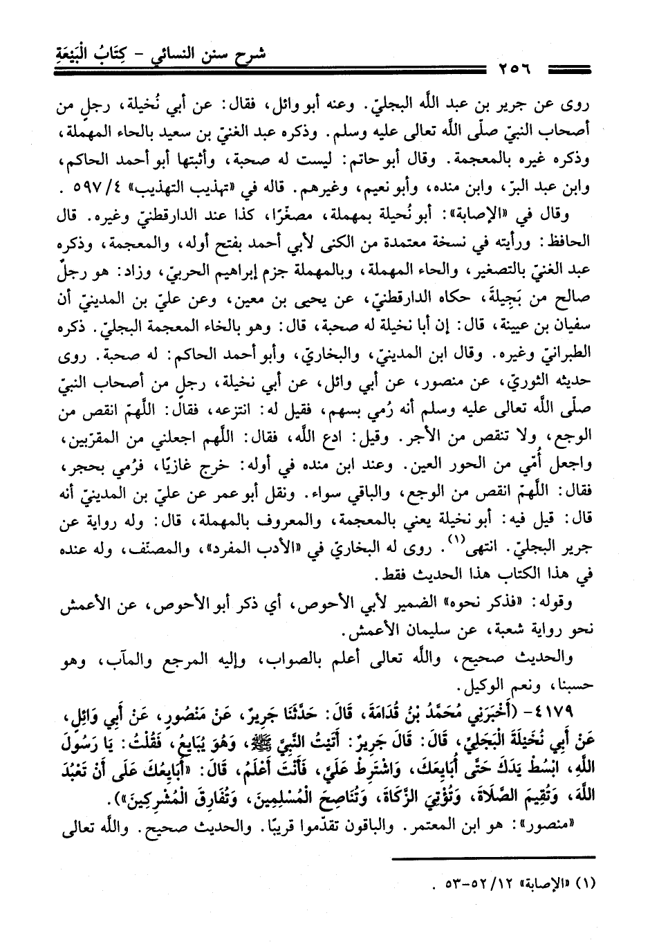 4179 - (أَخْبَرَنِي مُحَمَّدُ بْنُ قُدَامَةَ، قَالَ: حَدَّثَنَا جَرِيرٌ، عَنْ مَنْصُورٍ، عَنْ أَبِي وَائِلٍ، عَنْ أَبِي نُخَيْلَةَ الْبَجَلِيِّ، قَالَ: قَالَ جَرِيرٌ: أَتَيْتُ النَّبِيَّ -صلى الله عليه وسلم-، وَهُوَ يُبَايِعُ، فَقُلْتُ: يَا رَسُولَ اللَّهِ، ابْسُطْ يَدَكَ حَتَّى أُبَايِعَكَ، وَاشْتَرِطْ عَلَيَّ، فَأَنْتَ أَعْلَمُ، قَالَ: "أُبَايِعُكَ عَلَى أَنْ تَعْبُدَ اللَّهَ، وَتُقِيمَ الصَّلاَةَ، وَتُؤْتِيَ الزَّكَاةَ، وَتُنَاصِحَ الْمُسْلِمِينَ، وَتُفَارِقَ الْمُشْرِكِينَ").