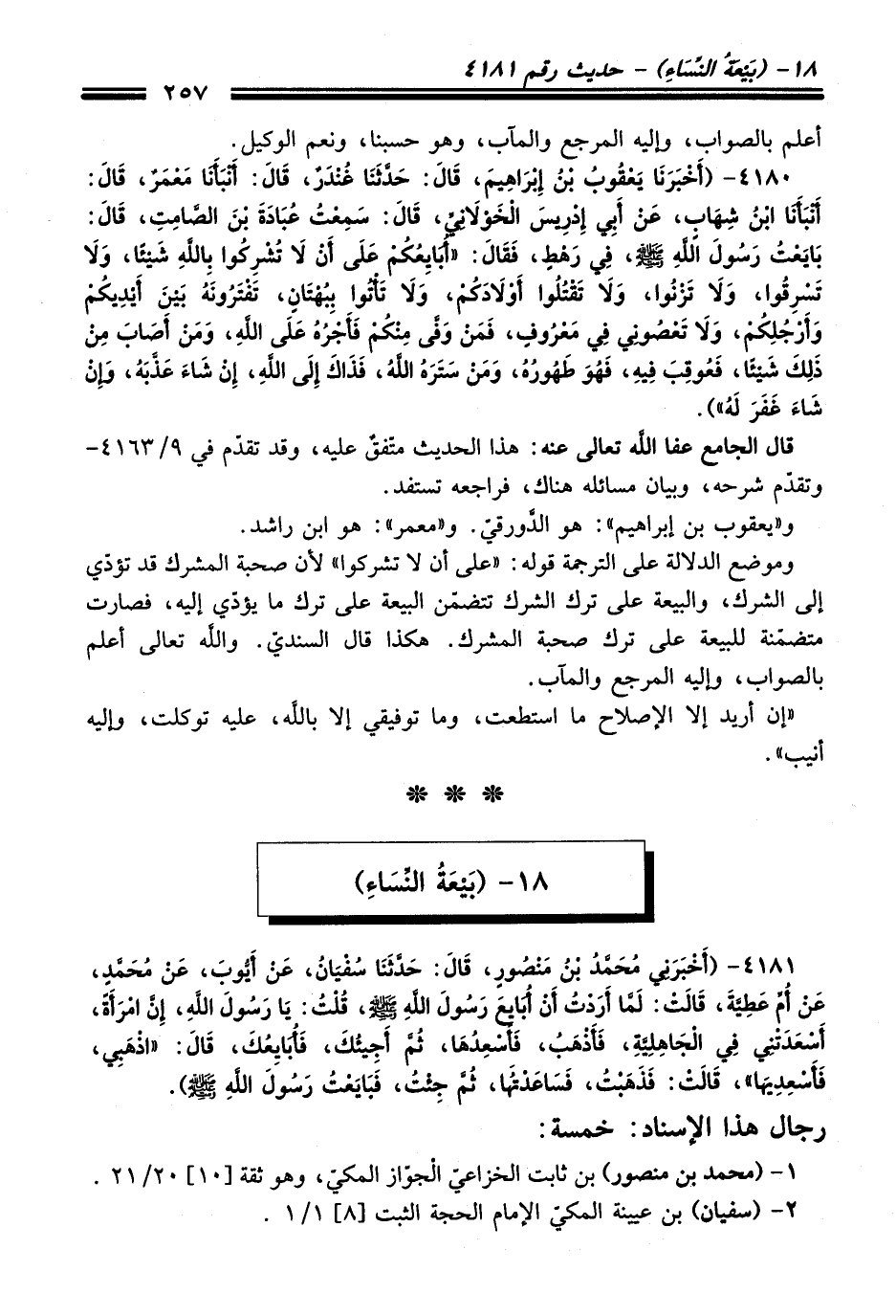 4181 - (أَخْبَرَنِي مُحَمَّدُ بْنُ مَنْصُورٍ، قَالَ: حَدَّثَنَا سُفْيَانُ، عَنْ أَيُّوبَ، عَنْ مُحَمَّدٍ، عَنْ أُمِّ عَطِيَّةَ، قَالَتْ: لَمَّا أَرَدْتُ أَنْ أُبَايِعَ رَسُولَ اللَّهِ -صلى الله عليه وسلم- قُلْتُ: يَا رَسُولَ اللَّهِ، إِنَّ امْرَأَةً، أَسْعَدَتْنِي فِي الْجَاهِلِيَّةِ، فَأَذْهَبُ، فَأُسْعِدُهَا، ثُمَّ أَجِيئُكَ، فَأُبَايِعُكَ، قَالَ: "اذْهَبِي، فَأَسْعِدِيهَا"، قَالَتْ: فَذَهَبْتُ، فَسَاعَدْتُهَا، ثُمَّ جِئْتُ، فَبَايَعْتُ رَسُولَ اللَّهِ -صلى الله عليه وسلم-).