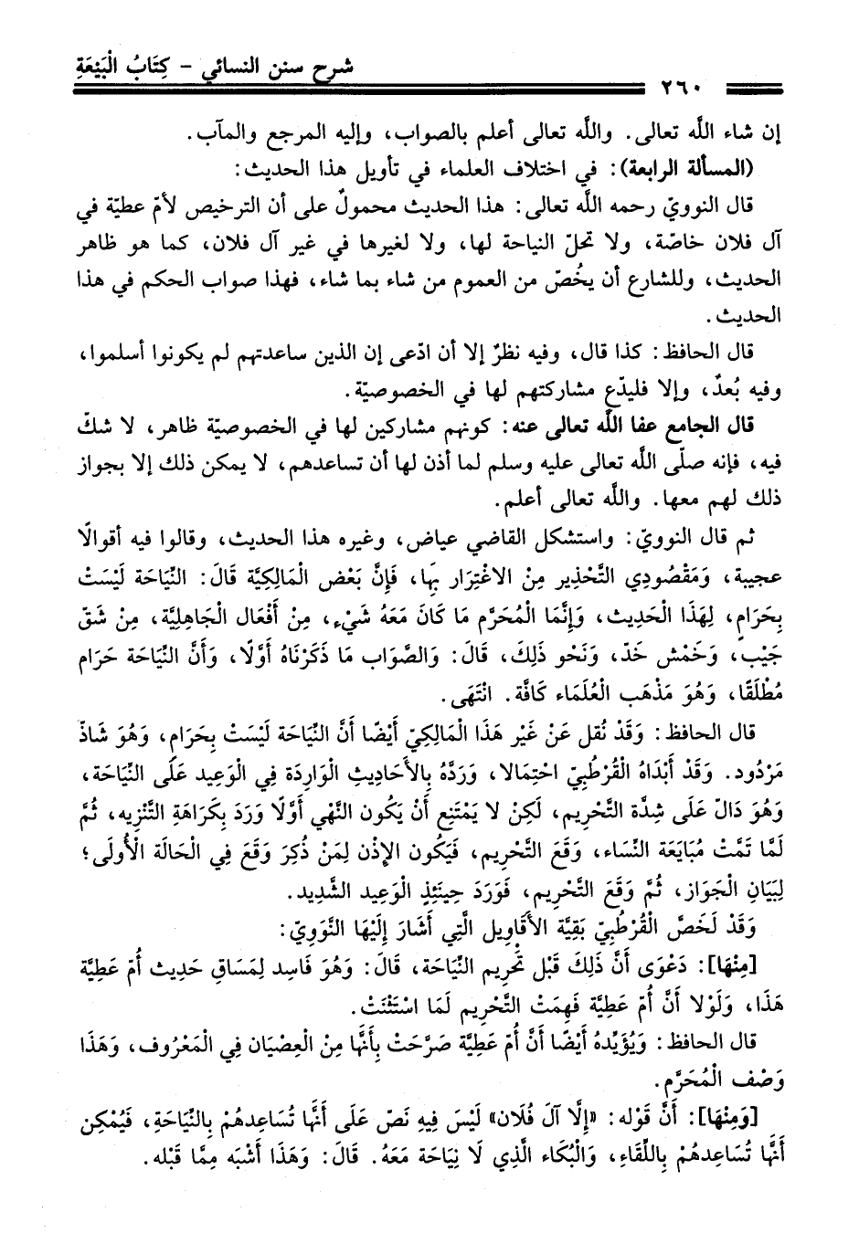 ثم قَالَ النوويّ: واستشكل القاضي عياض، وغيره هَذَا الحديث، وقالوا فيه أقوالاً عجيبة، وَمَقْصُودِي التَّحْذِير منْ الاغْتِرار بها، فإِن بعض المالِكِيَّة قَالَ: النِّياحة ليْسَتْ بِحرامٍ، لِهذا الحديث، وإنَّمَا المُحرَّم ما كَانَ مَعَهُ شَيْء، منْ أفعال الجاهِليَّة، منْ شق جيب، وَخمْش خَدّ، ونحو ذَلِكَ، قَالَ: والصّواب ما ذكرناهُ أولاً، وأنَّ النياحة حَرَام مُطلقًا، وهُو مذهب العُلَمَاء كَافَّة. انتهى.