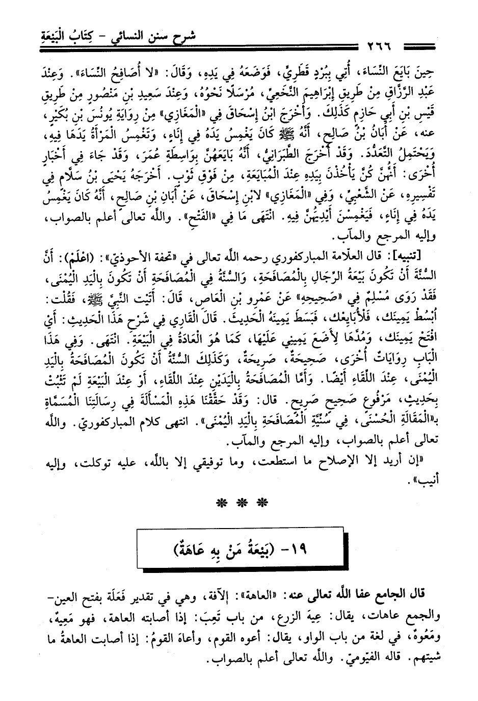 [تنبيه]: قَالَ العلّامة المباركفوري رحمه الله تعالى فِي "تحفة الأحوذي": (اعلم): أنَّ السُّنَّة أن تكُون بيعةُ الرِّجالِ بِالمُصَافَحَةِ، والسُّنَّةُ فِي المُصافحةِ أن تكُون بِاليدِ اليُمنى، فقد روى مُسْلِمٌ فِي "صحِيحِهِ" عن عمرِو بنِ الْعَاصِ، قَالَ: أتَيْت النَّبِيَّ -صلى الله عليه وسلم-، فقُلت: اُبسُط يمِينك، فلأُبايِعْك، فبسط يمِينهُ الحديث. قَالَ القَارِي فِي شَرْح هَذَا الحديث: أيْ افتح يمِينك، ومُدَّهَا لِأضَعَ يمِينِي عَلَيْهَا، كما هُو العادةُ فِي البَيْعَةِ. انتهى. وفِي هَذَا الباب رِوايات أُخرى، صحِيحةٌ، صرِيحةٌ، وكذلِك السُّنَّةُ أن تكُون المصافحةُ باليد اليمني، عِند اللِّقاءِ أيضًا. وأمَّا المصافحة بِاليدين عِند اللِّقاء، أو عِند البيعةِ لم تثبُت بِحدِيثٍ، مرفُوعٍ صحِيحٍ صرِيحٍ. قَالَ: وَقَدْ حققنا هذِهِ المسألة فِي رِسالتِنا المُسمَّاةِ بـ"المقالةِ الحُسْنَى، فِي سُنِّيَّةِ المُصَافَحَةِ باليَد اليُمْنَى". انتهى كلام المباركفوريّ. والله تعالى أعلم بالصواب، وإليه المرجع والمآب.