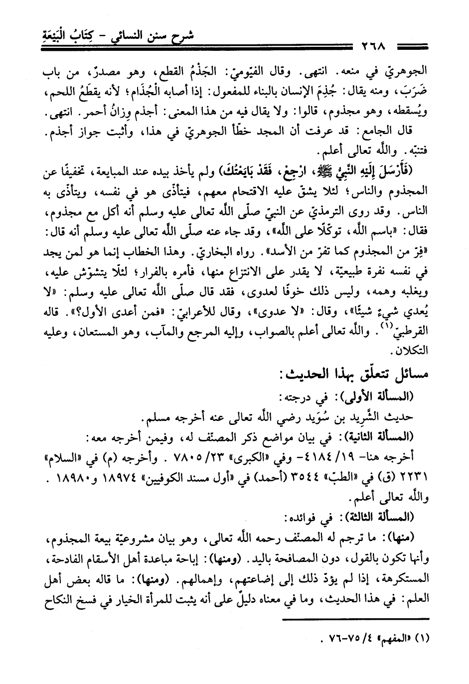 (فَأَرْسَلَ إِلَيْهِ النَّبِيُّ -صلى الله عليه وسلم-، ارْجِعْ، فَقَدْ بَايَعْتُكَ) ولم يأخذ بيده عند المبايعة، تخفيفًا عن المجذوم والناس؛ لئلا يشقّ عليه الاقتحام معهم، فيتأذّي هو فِي نفسه، ويتأذّى به الناس. وَقَدْ روى الترمذيّ عن النبيّ صلّى الله تعالى عليه وسلم أنه أكل مع مجذوم، فقال: "باسم الله، توكّلاً علي الله"، وَقَدْ جاء عنه صلّى الله تعالى عليه وسلم أنه قَالَ: "فِرّ منْ المجذوم كما تفرّ منْ الأسد". رواه البخاريّ. وهذا الخطاب إنما هو لمن يجد فِي نفسه نفرة طبيعيّة، لا يقدر عَلَى الانتزاع منها، فأمره بالفرار؛ لئلا يتشوّش عليه، ويغلبه وهمه، وليس ذلك خوفاً لعدوى، فقد قَالَ صلّى الله تعالى عليه وسلم: "لا يُعدي شيءٌ شيئاً"، وَقَالَ: "لا عدوى"، وَقَالَ للأعرابيّ: "فمن أعدى الأول؟ ". قاله القرطبيّ (¬1). والله تعالى أعلم بالصواب، وإليه المرجع والمآب، وهو المستعان، وعليه التكلان.
