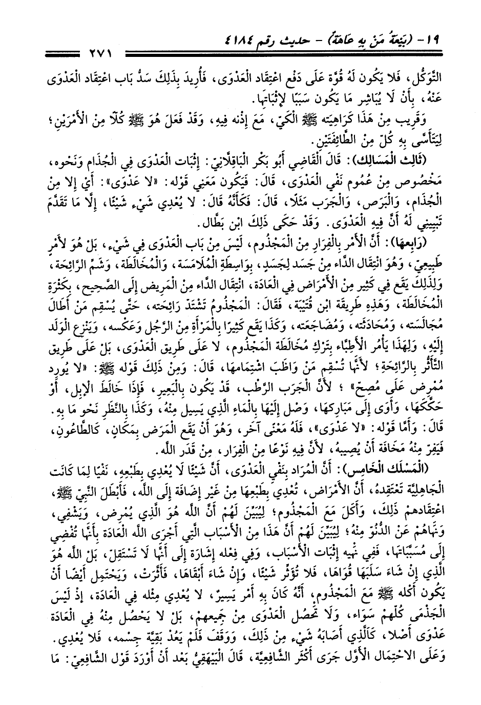 (المَسْلَك الخَامِس): أن المراد بِنفيِ العدوي، أنَّ شيئًا لا يُعدِي بطبعِهِ، نفيًا لِما كانت الجاهِليَّة تعتقِدهُ، أنَّ الأمراض، تُعدِي بِطبعِها منْ غير إِضافة إِلى الله، فأبطل النَّبِيّ -صلى الله عليه وسلم-, اعتِقادهم ذَلِكَ، وأكل مع المجذوم؛ لِيُبيِّن لهُم أنَّ الله هُو الّذِي يُمرِض، وَيَشْفِي، وَنَهَاهُم عن الدُّنُو مِنه؛ لِيُبين لهُمْ أن هَذَا منْ الأسباب الَّتِي أجرى الله العادة بِأنَّها تُفْضِي إِلى مُسَبَّبَاتهَا، ففِي نهيه إِثبات الأسباب، وفِي فِعله إِشاِرة إِلى أنَّها لا تستقِل، بَلْ الله هُو الَّذِي إنْ شاء سلبها قُواها، فلا تُؤثِّر شيئًا، وإن شاء أبقاها، فأثَّرْت، وَيَحْتَمِل أيْضًا أنْ يَكُون أَكْله -صلى الله عليه وسلم- مع الْمَجْذوم؛ أَنَّهُ كَانَ بِهِ أمر يَسيرٌ، لا يُعدِي مِثْله فِي العادة، إذْ لَيْسَ الْجَذْمَى كُلّهم سواء، ولا تَحصُل العدوَي منْ جميعهم، بَلْ لا يحصُل مِنْهُ فِي العادة عَدْوى أصْلا، كالذِي أصَابَهُ شَيْء منْ ذَلِكَ، وَوَقَف فَلَمْ يعُد بقِيَّة جِسمه، فلا يُعْدِي. وَعَلى الاحْتِمَال الأوَّل جَرَى أَكْثَر الشَّافِعِيَّة، قَالَ الْبَيْهقِيُّ بَعْد أن أوْرَدَ قَوْل الشَّافِعِيّ: ما