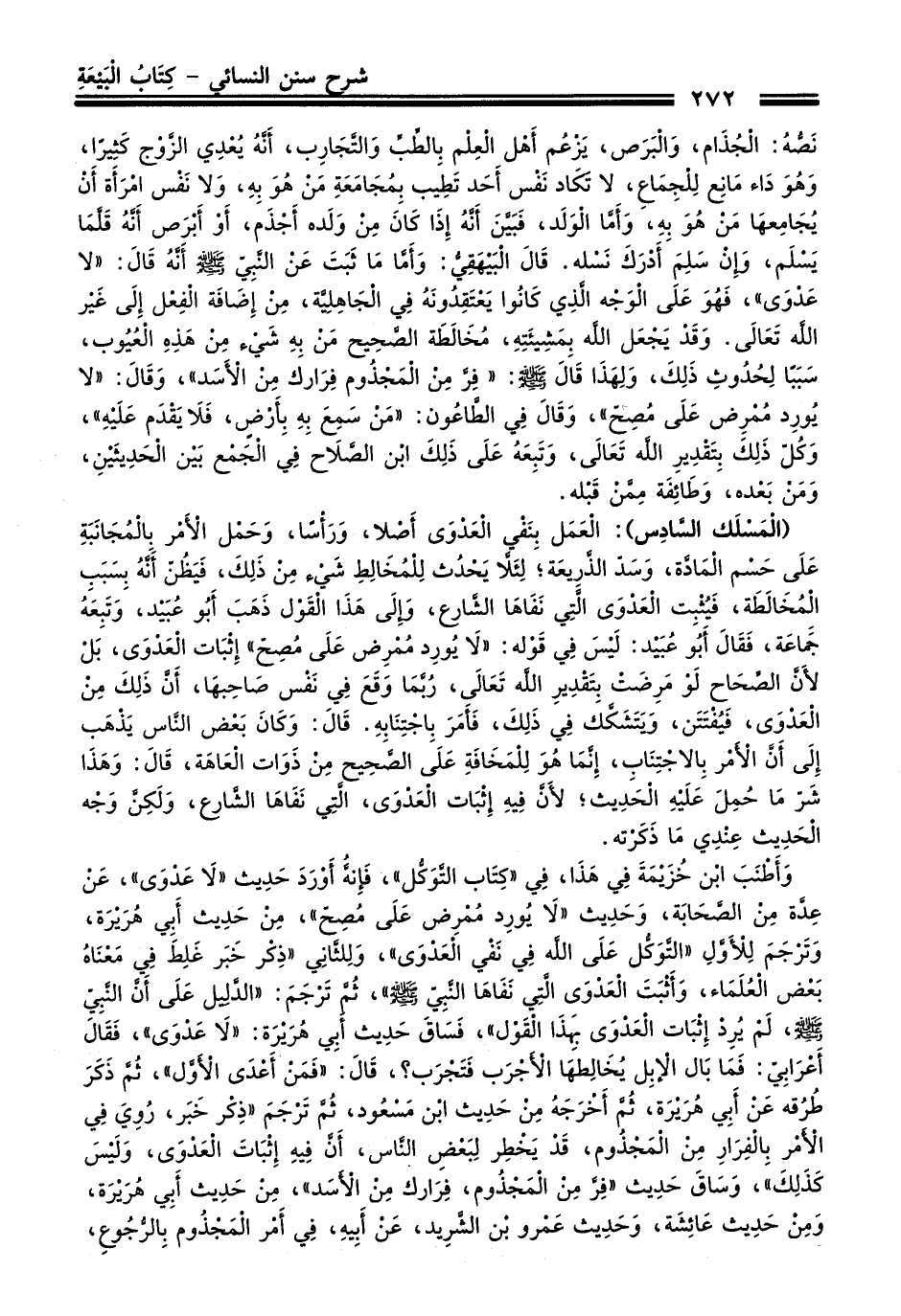 نَصُّهُ: الجُذام، والبرص، يزعُم أهل العِلم بالطِّبِّ والتَّجارِب، أنَّهُ يُعدِي الزَّوج كثِيرًا، وهُو داء مانِع لِلْجِمَاعِ، لا يكاد نَفْس أحد تطِيب بِمُجامعةِ منْ هُو بِهِ، ولا نفس امرأة أن يُجامِعها منْ هُو بِهِ، وأمَّا الولد، فبيَّن أَنَّهُ إِذَا كَانَ منْ ولده الجذام، أو أبرص أنَّهُ قَلَّمَا يسلم، وإن سلِم أدرك نَسْله. قَالَ البيهقِيُّ: وأمَّا ما ثبت عن النَّبِيّ -صلى الله عليه وسلم- أَنَّهُ قَالَ: "لا عدوى"، فهُو عَلَى الوجه الَّذِي كانُوا يعتقِدُونهُ فِي الجاهِلِية، منْ إِضافة الفِعل إِلى غير الله تعالى. وَقَدْ يجعل الله بِمشِيئتِهِ، مُخالطة الصحِيح منْ بِهِ شَيْء منْ هذِهِ العُيُوب، سببًا لِحُدُوثِ ذَلِكَ، ولِهذا قَالَ -صلى الله عليه وسلم-: "فِرَّ مِنْ المَجْذُوم فِرارك منْ الأسَد"، وَقَالَ: "لا يُورِد مُمْرِض عَلَى مُصِحّ"، وَقَالَ فِي الطاعُون: "منْ سمِع بِهِ بِأرْضٍ، فلا يَقْدَم عَلَيْهِ"، وكُلّ ذَلِكَ بِتقدِيرِ الله تعالى، وتبِعهُ عَلَى ذَلِكَ ابن الصَّلاح فِي الجمع بين الحدِيثينِ، ومن بعده، وطائِفة مِمَّن قبله.