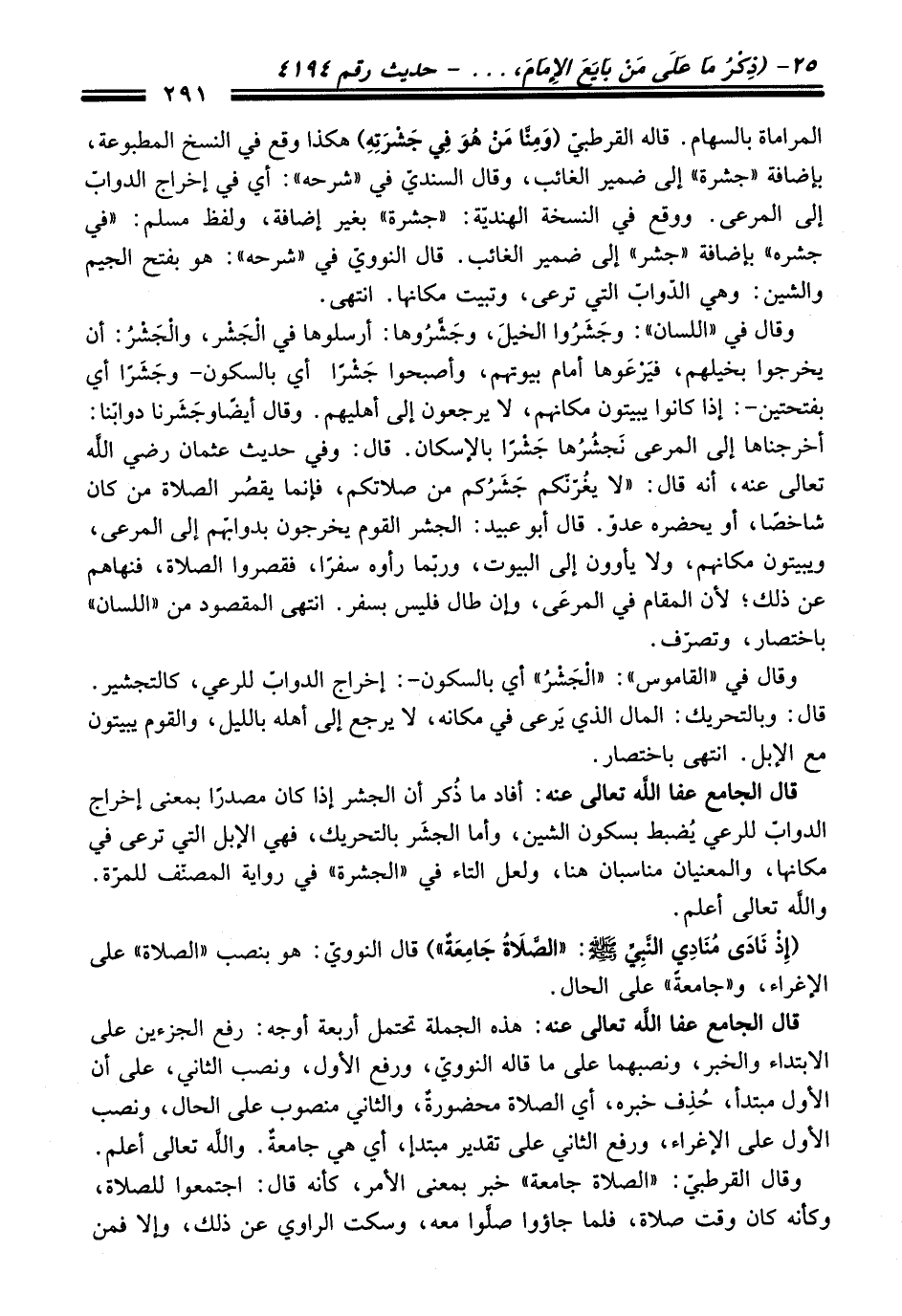 وَقَالَ فِي "اللسان": وجشرُوا الخيلَ، وجَشَّرُوها: أرسلوها فِي الجشر، والْجَشْرُ: أن يخرجوا بخيلهم، فيرعوها أمام بيوتهم، وأصبحوا جَشْرًا أي بالسكون -وجشرًا أي بفتحتين-: إذا كانوا يبيتون مكانهم، لا يرجعون إلى أهليهم. وَقَالَ أيضًا وجَشَرنا دوابّنا: أخرجناها إلى المرعى نَجشُرُها جشرًا بالإسكان. قَالَ: وفي حديث عثمان رضي الله تعالى عنه، أنه قَالَ: "لا يغُرّنّكم جَشَرُكم منْ صلاتكم، فإنما يقصُر الصلاة منْ كَانَ شاخصًا، أو يحضره عدوّ. قَالَ أبو عبيد: الجشر القوم يخرجون بدوابّهم إلى المرعى، ويبيتون مكانهم، ولا يأوون إلى البيوت، وربّما رأوه سفرًا، فقصروا الصلاة، فنهاهم عن ذلك؛ لأن المقام فِي المرعَى، وإن طال فليس بسفر. انتهى المقصود منْ "اللسان" باختصار، وتصرّف.