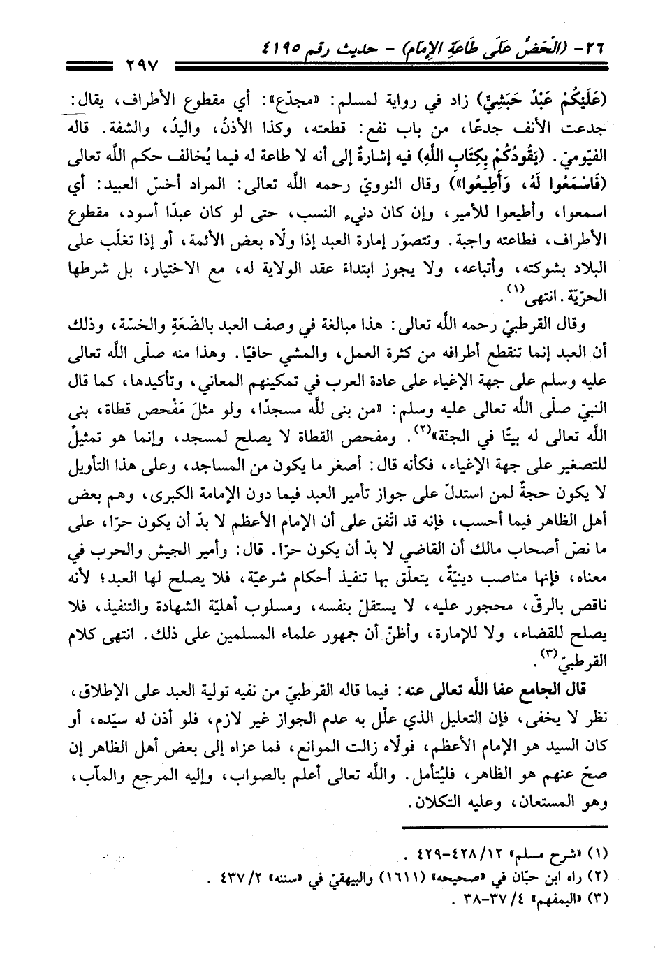 وَقَالَ القرطبيّ رحمه الله تعالى: هَذَا مبالغة فِي وصف العبد بالضّعةِ والخسّة، وذلك أن العبد إنما تنقطع أطرافه منْ كثرة العمل، والمشي حافيًا. وهذا منه صلّى الله تعالى عليه وسلم عَلَى جهة الإغياء عَلَى عادة العرب فِي تمكينهم المعاني، وتأكيدها، كما قَالَ النبيّ صلّى الله تعالى عليه وسلم: "منْ بني لله مسجدًا , ولو مثلَ مَفْحص قطاة، بني الله تعالى له بيتًا فِي الجنة" (¬2). ومفحص القطاة لا يصلح لمسجد، وإنما هو تمثيلٌ للتصغير عَلَى جهة الإغياء، فكأنه قَالَ: أصغر ما يكون منْ المساجد، وعلى هَذَا التأويل لا يكون حجةٌ لمن استدل عَلَى جواز تأمير العبد فيما دون الإمامة الكبرى, وهم بعض أهل الظاهر فيما أحسب، فإنه قد اتّفق عَلَى أن الإِمام الأعظم لابدّ أن يكون حرّا، عَلَى ما نصّ أصحاب مالك أن القاضي لابدّ أن يكون حرًا. قَالَ: وأمير الجيش والحرب فِي معناه، فإنها مناصب دينيّةٌ، يتعلق بها تنفيذ أحكام شرعيّة، فلا يصلح لها العبد؛ لأنه ناقص بالرقّ، محجور عليه، لا يستقلّ بنفسه، ومسلوب أهليّة الشهادة والتنفيذ، فلا يصلح للقضاء، ولا للإمارة، وأظنّ أن جمهور علماء المسلمين عَلَى ذلك. انتهى كلام القرطبيّ (¬3).