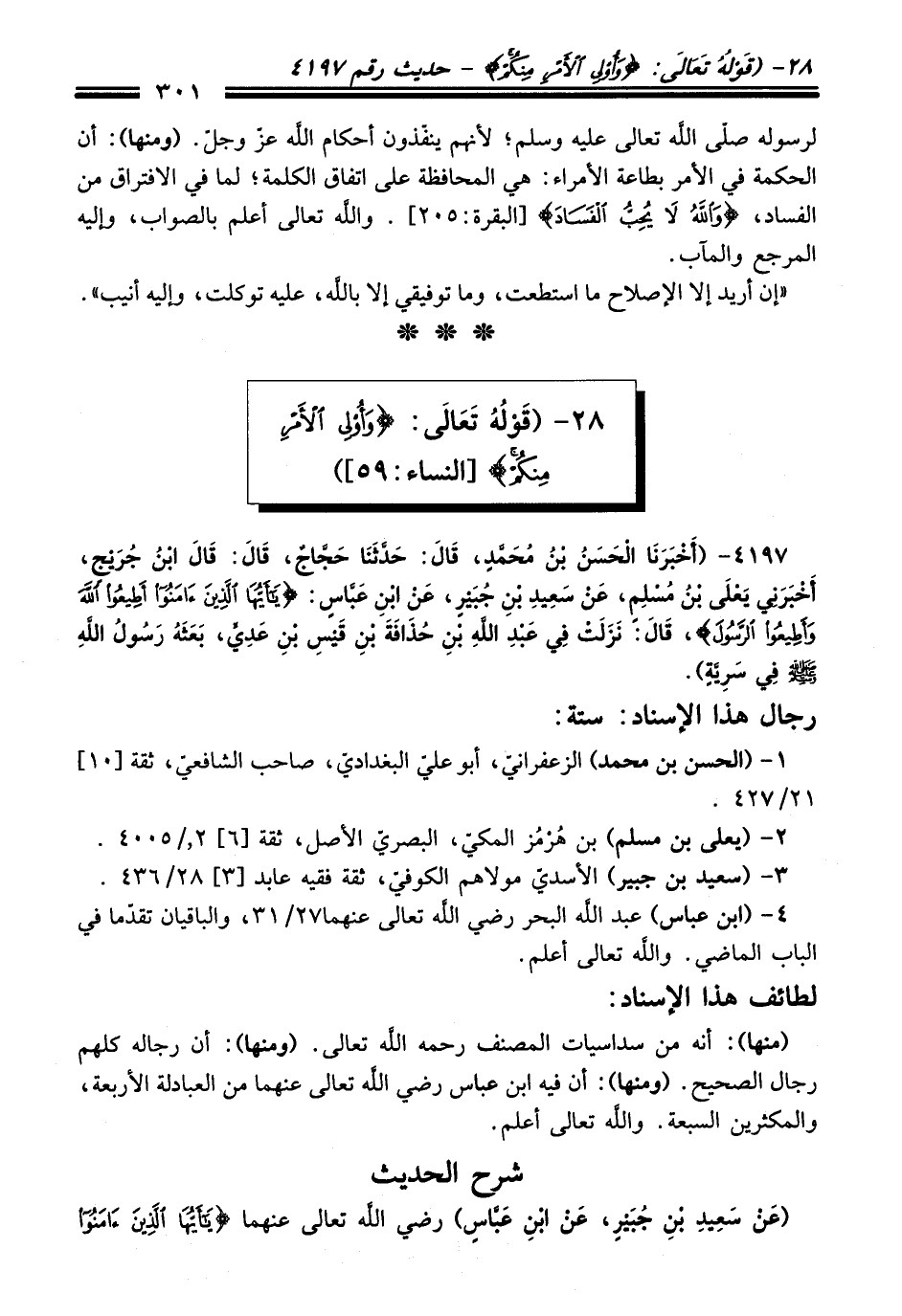 4197 - (أَخْبَرَنَا الْحَسَنُ بْنُ مُحَمَّدٍ، قَالَ: حَدَّثَنَا حَجَّاجٌ، قَالَ: قَالَ ابْنُ جُرَيْجٍ، أَخْبَرَنِي يَعْلَى بْنُ مُسْلِمٍ، عَنْ سَعِيدِ بْنِ جُبَيْرٍ، عَنِ ابْنِ عَبَّاسٍ: {يَا أَيُّهَا الَّذِينَ آمَنُوا أَطِيعُوا اللَّهَ وَأَطِيعُوا الرَّسُولَ} قَالَ: نَزَلَتْ فِي عَبْدِ اللَّهِ بْنِ حُذَافَةَ بْنِ قَيْسِ بْنِ عَدِيٍّ، بَعَثَهُ رَسُولُ اللَّهِ -صلى الله عليه وسلم- فِي سَرِيَّةٍ).