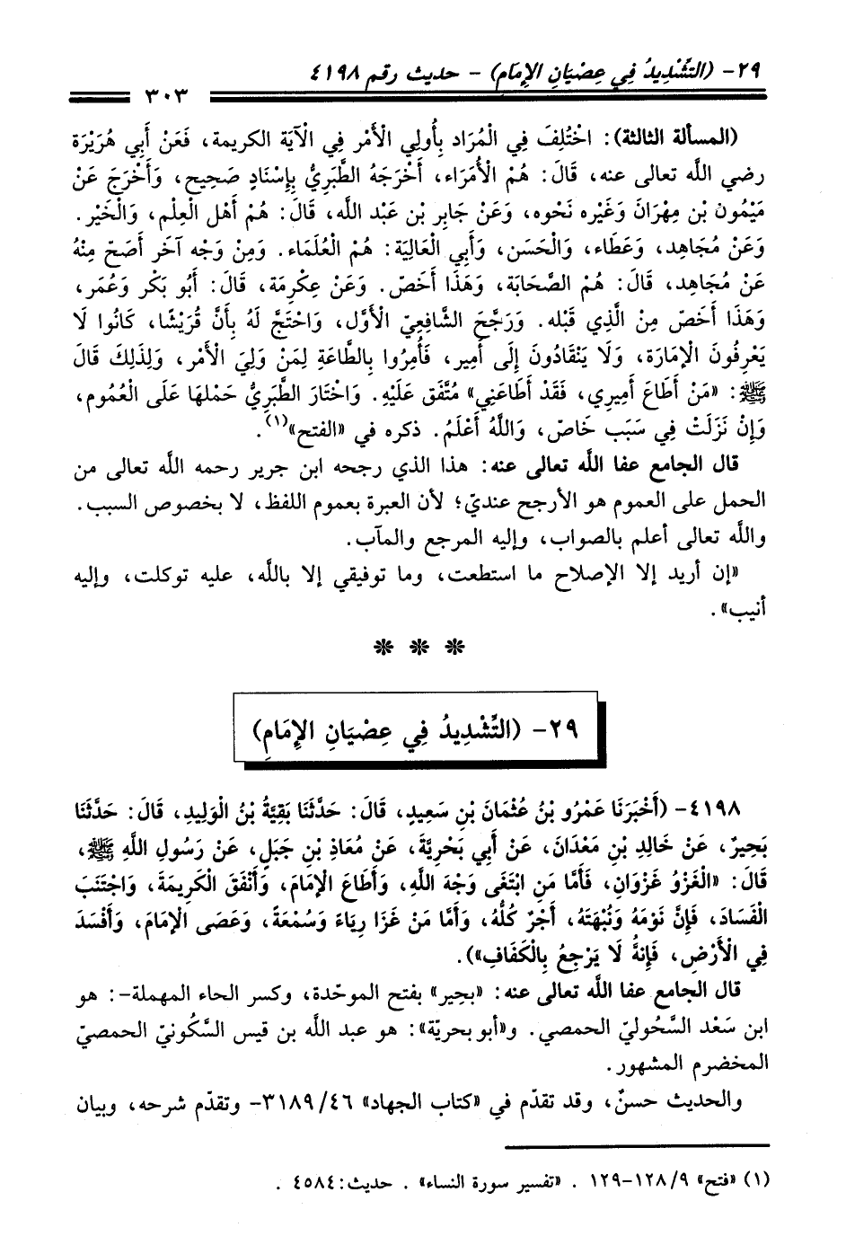 (المسألة الثالثة): اختُلِف فِي المراد بِأُولي الأمر فِي الآية الكريمة، فعن أبي هريرة رضي الله تعالى عنه، قَالَ: هُم الأمراء، أخرجهُ الطَّبرِيّ بِإِسنادِ صحِيح، وأخرج عن ميمُون بن مِهران وغيره نَحْوه، وعن جابِر بن عبد الله، قَالَ: هُم أهل الْعِلْم، والْخَيْر. وعن مُجاهِد، وعطاء، والْحَسَن، وأبِي العالِية: هُم الْعُلَمَاء. ومن وجه آخر أصَحّ مِنْهُ عن مُجاهِد، قَالَ: هُمْ الصَّحَابة، وهذا أخَصّ. وعن عِكرِمة، قَالَ: أبُو بكر وعُمر، وهذا أخَصّ منْ الَّذِي قَبْله. ورجح الشافِعِي الأول، واحتج لهُ بِأن قُريشًا، كانُوا لا يعرِفُون الإمارة، ولا ينقادُون إِلى أمِير، فأُمِرُوا بِالطَّاعةِ لِمن ولِي الأمر، ولِذلِك قَالَ -صلى الله عليه وسلم-: "منْ أطاع أمِيرِي، فقد أطاعنِي" مُتفق عَلَيْهِ. واختار الطَّبريُّ حملها عَلَى العُمُوم، وإن نزلت فِي سبب خَاص، واللهُ أعلمُ. ذكره فِي "الفتح" (¬1).