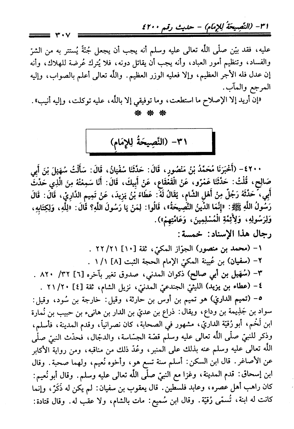 4200 - (أَخْبَرَنَا مُحَمَّدُ بْنُ مَنْصُورٍ، قَالَ: حَدَّثَنَا سُفْيَانُ، قَالَ: سَأَلْتُ سُهَيْلَ بْنَ أَبِي صَالِحٍ، قُلْتُ: حَدَّثَنَا عَمْرٌو، عَنِ الْقَعْقَاعِ، عَنْ أَبِيكَ، قَالَ: أَنَا سَمِعْتُهُ مِنَ الَّذِي حَدَّثَ أَبِي، حَدَّثَهُ رَجُلٌ مِنْ أَهْلِ الشَّامِ، يُقَالُ لَهُ: عَطَاءُ بْنُ يَزِيدَ، عَنْ تَمِيمٍ الدَّارِيِّ، قَالَ: قَالَ رَسُولُ اللَّهِ -صلى الله عليه وسلم-: "إِنَّمَا الدِّينُ النَّصِيحَةُ"، قَالُوا: لِمَنْ يَا رَسُولَ اللَّهِ؟ قَالَ: "لِلَّهِ، وَلِكِتَابِهِ، وَلِرَسُولِهِ، وَلأَئِمَّةِ الْمُسْلِمِينَ، وَعَامَّتِهِمْ").