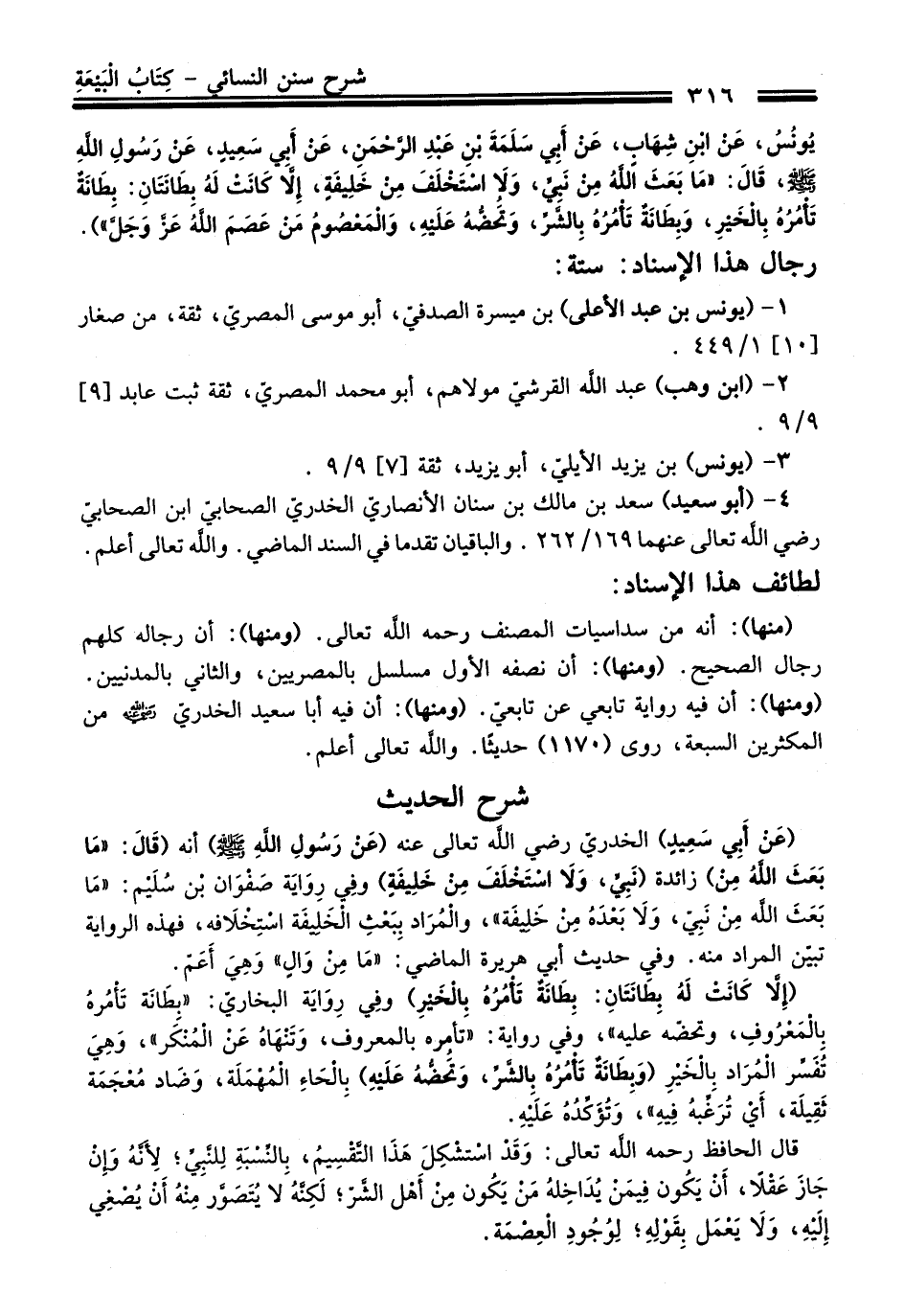 (منها): أنه منْ سداسيات المصنّف رحمه الله تعالى. (ومنها): أن رجاله كلهم رجال الصحيح. (ومنها): أن نصفه الأول مسلسل بالمصريين، والثاني بالمدنيين. (ومنها): أن فيه رواية تابعيّ عن تابعيّ. (ومنها): أن فيه أبا سعيد الخدريّ -رضي الله عنه- منْ المكثرين السبعة، روى (1170) حديثَا. والله تعالى أعلم.