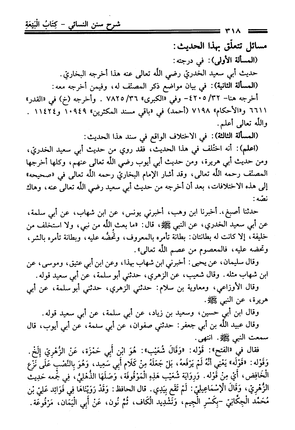 فقال فِي "الفتح": قوله: "وَقَالَ شُعَيْب": هُو ابن أبِي حمزة، عن الزُّهريّ إِلَخْ. وقوله: "قوله" يعني أَنَّهُ لم يرفعهُ، بَلْ جعلهُ منْ كلام أبِي سعِيد، وهُو بِالنَّصْب عَلَى نَزْع الخَافِض، أي منْ قوله. ورِواية شُعيب هذِهِ الموقُوفة، وصَلهَا الذُّهلِيُّ، فِي جمعه حدِيث الزُّهريّ، وَقَالَ الإسْماعِيليّ: لم تقع بِيَدِي. قَالَ الحافظ: وَقَدْ رَوَيْناها فِي فَوائِد عَلِيّ بن مُحَمَّد الجِكَّانِيّ -بِكسرِ الجِيم، وَتَشْدِيد الْكَاف، ثُمَّ نُون، عن أبِي اليَمَان، مَرْفُوعَة.