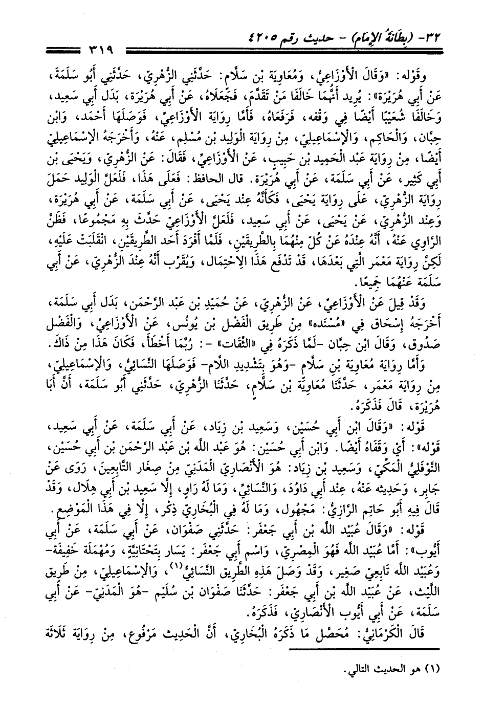 وقَوْله: "وَقَالَ الأوْزاعِيُّ، ومُعاوِية بن سَلَّام: حدَّثني الزُّهرِيّ، حَدَّثني أبُو سَلَمَة، عن أبي هريرة": يُرِيد أنَّهُما خالفا منْ تقدَّم، فَجَعلاهُ، عن أبي هريرة، بَدَل أبي سعِيد، وخالفا شُعيبًا أيضًا فِي وقفه، فَرَفَعاهُ، فأمَّا رِواية الأوْزَاعِيِّ، فوَصلَهَا أحمد، وابن حِبَّان، والحاكِم، والإسْمَاعيليّ، منْ رِواية الوليد بن مُسلم، عنهُ، وأخرجهُ الإسْماعيليّ أيضًا، مِن رِواية عبد الحمِيد بن حبِيب، عَنْ الأوزاعِيِّ، فقال: عن الزُّهْريّ، وَيَحْيَى بن أبِي كثِير، عن أبِي سَلَمَة، عن أبي هُريرة. قَالَ الحافظ: فَعَلى هَذَا، فلعلَّ الولِيد حَمَل رِواية الزُّهريّ، عَلَى رِوَاية يَحْيى، فكأنَّهُ عِنْد يَحْيى، عن أبِي سلمة، عَنْ أبي هُريْرة، وعِند الزُّهرِيِّ، عن يحيى، عن أبِي سَعِيد، فلعلَّ الأوْزاعيِّ حدَّث بِهِ مَجْمُوعًا، فظنَّ الرَّاوِي عنهُ، أَنَّهُ عِنْدهُ عَنْ كُل مِنْهُما بِالطَّرِيقينِ، فَلمَّا أفرد أحد الطَّرِيقينِ، انْقَلبَتْ عَلَيْهِ، لكِنَّ رِواية معمر الَّتِي بعدها، قد تدفع هَذَا الِاحْتِمَال، وُيقرِّب أَنَّهُ عِند الزُّهرِيّ، عن أبِي سَلَمَة عنْهُما جَميعًا.