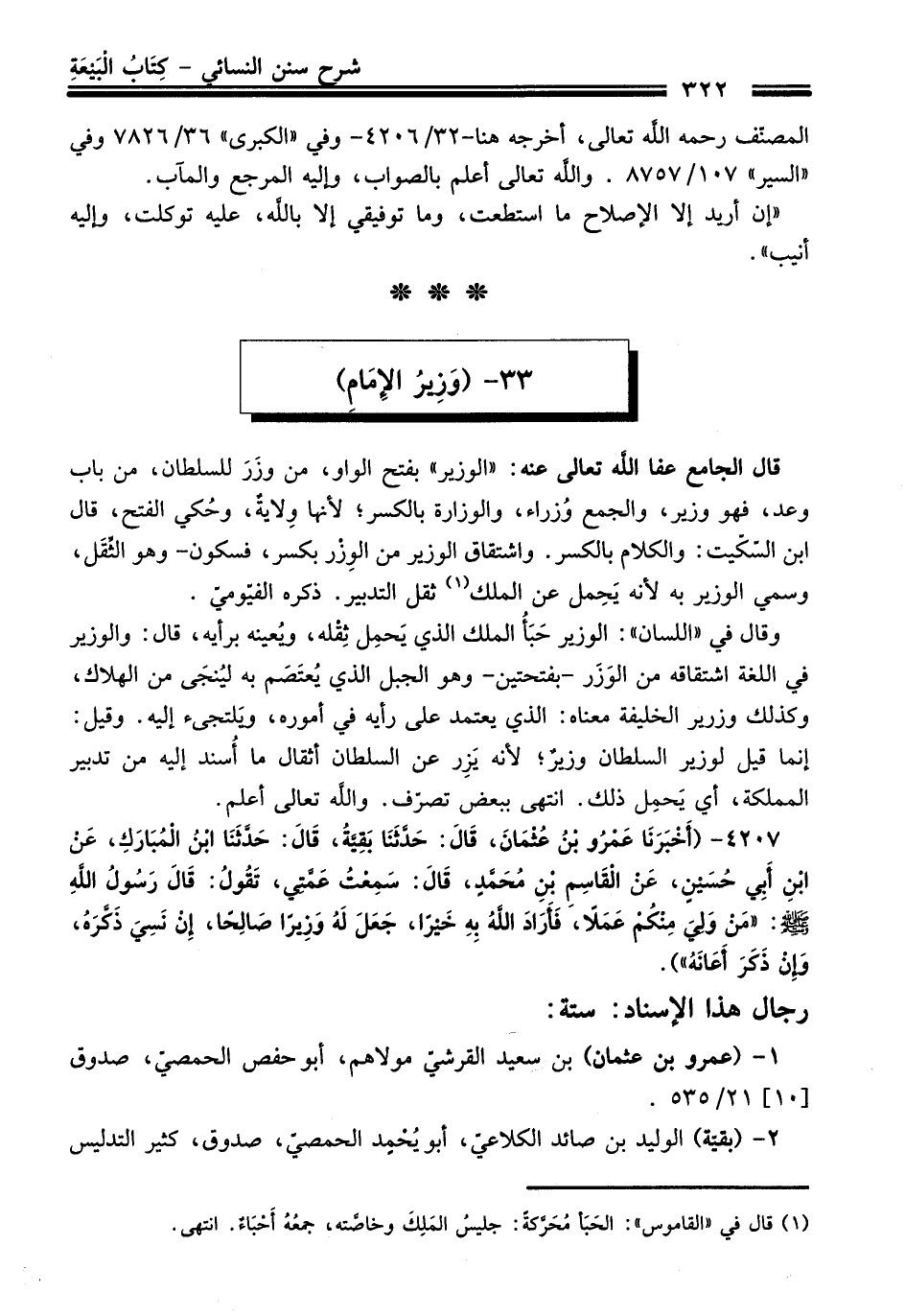 4207 - (أَخْبَرَنَا عَمْرُو بْنُ عُثْمَانَ، قَالَ: حَدَّثَنَا بَقِيَّةُ، قَالَ: حَدَّثَنَا ابْنُ الْمُبَارَكِ، عَنِ ابْنِ أَبِي حُسَيْنٍ، عَنِ الْقَاسِمِ بْنِ مُحَمَّدٍ، قَالَ: سَمِعْتُ عَمَّتِي، تَقُولُ: قَالَ رَسُولُ اللَّهِ -صلى الله عليه وسلم-: "مَنْ وَلِيَ مِنْكُمْ عَمَلاً، فَأَرَادَ اللَّهُ بِهِ خَيْرًا، جَعَلَ لَهُ وَزِيرًا صَالِحًا، إِنْ نَسِيَ ذَكَّرَهُ، وَإِنْ ذَكَرَ أَعَانَهُ").