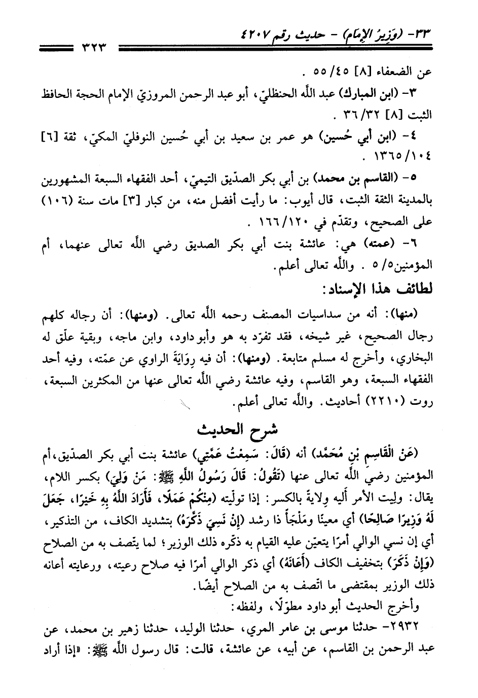 (عَنِ الْقَاسِمِ بْنِ مُحَمَّدٍ) أنه (قَالَ: سَمِعْتُ عَمَّتِي) عائشة بنت أبي بكر الصدّيق، أم المؤمنين رضي الله تعالى عنها (تقُولُ: قَالَ رسُولُ اللهِ -صلى الله عليه وسلم-: مَنْ وَلِيَ) بكسر اللام، يقال: ولِيت الأمر أَليه وِلايةً بالكسر: إذا تولّيته (مِنْكُمْ عَمَلاً، فَأَرَادَ اللَّهُ بِهِ خَيْرًا، جَعَلَ لَهُ وَزِيرًا صَالِحًا) أي معينًا وملجأ ذا رشد (إِنْ نَسِيَ ذَكَّرَهُ) بتشديد الكاف، منْ التذكير، أي إن نسي الوالي أمراً يتعين عليه القيام به ذكره ذلك الوزير؛ لما يتّصف به منْ الصلاح (وَإِنْ ذَكَرَ) بتخفيف الكاف (أَعَانَهُ) أي ذكر الوالي أمرًا فيه صلاح رعيته، ورعايته أعانه ذلك الوزير بمقتضى ما اتّصف به منْ الصلاح أيضاً.