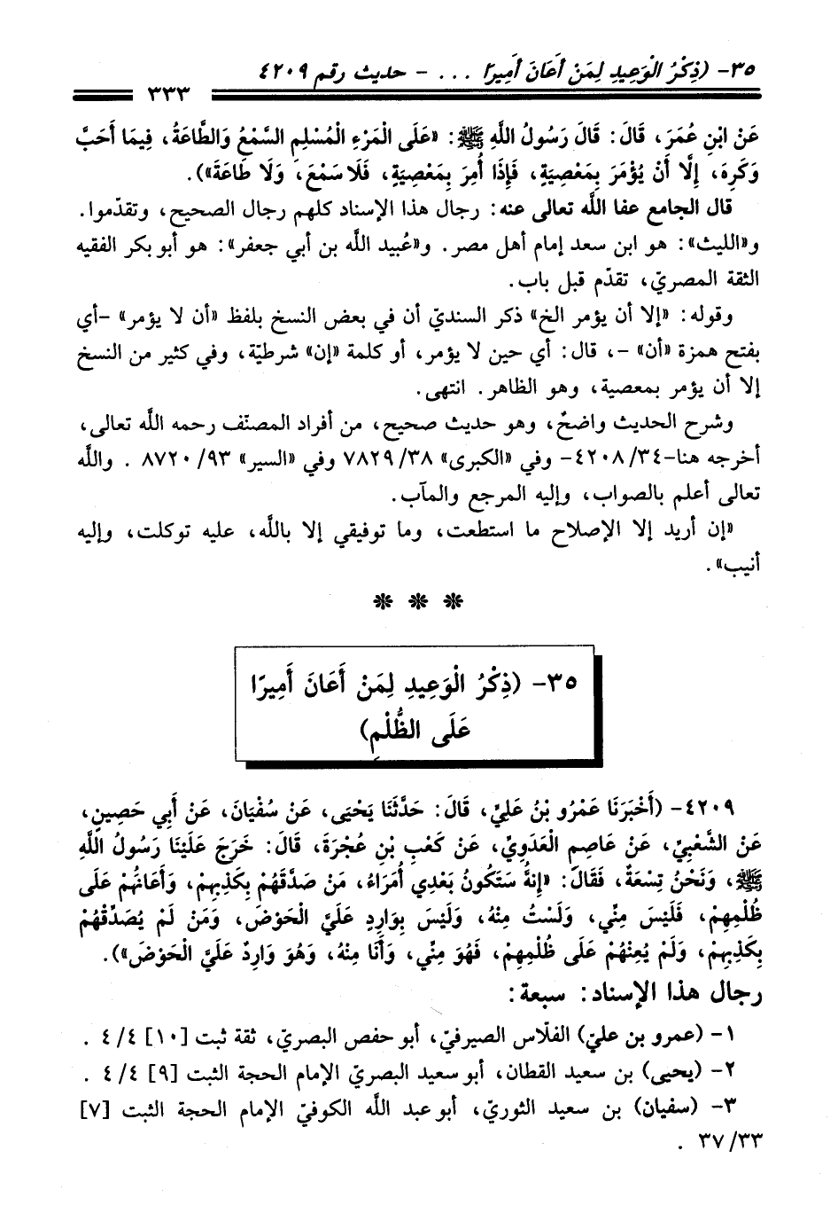 4209 - (أَخْبَرَنَا عَمْرُو بْنُ عَلِيٍّ، قَالَ: حَدَّثَنَا يَحْيَى، عَنْ سُفْيَانَ، عَنْ أَبِي حَصِينٍ، عَنِ الشَّعْبِيِّ، عَنْ عَاصِمٍ الْعَدَوِيِّ، عَنْ كَعْبِ بْنِ عُجْرَةَ، قَالَ: خَرَجَ عَلَيْنَا رَسُولُ اللَّهِ -صلى الله عليه وسلم-، وَنَحْنُ تِسْعَةٌ، فَقَالَ: "إِنَّهُ سَتَكُونُ بَعْدِي أُمَرَاءُ، مَنْ صَدَّقَهُمْ بِكَذِبِهِمْ، وَأَعَانَهُمْ عَلَى ظُلْمِهِمْ، فَلَيْسَ مِنِّي، وَلَسْتُ مِنْهُ، وَلَيْسَ بِوَارِدٍ عَلَيَّ الْحَوْضَ، وَمَنْ لَمْ يُصَدِّقْهُمْ بِكَذِبِهِمْ، وَلَمْ يُعِنْهُمْ عَلَى ظُلْمِهِمْ، فَهُوَ مِنِّي، وَأَنَا مِنْهُ، وَهُوَ وَارِدٌ عَلَيَّ الْحَوْضَ").