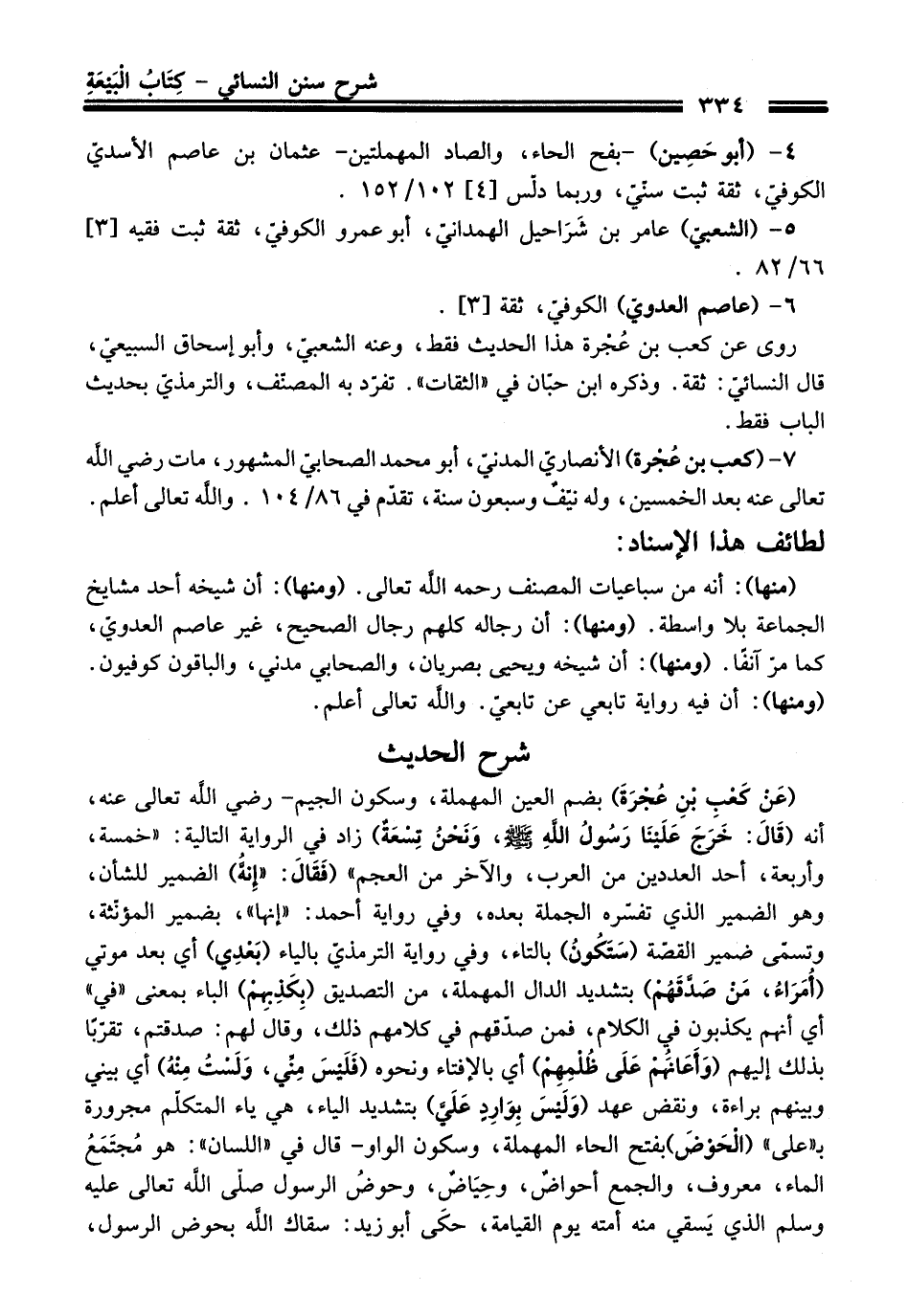 (عَنْ كَعْبِ بْنِ عُجْرَةَ) بضم العين المهملة، وسكون الجيم- رضي الله تعالى عنه، أنه (قَالَ: خَرَجَ عَلَيْنَا رسُولُ اللَّهِ -صلى الله عليه وسلم-، وَنَحْنُ تِسْعَةٌ) زاد فِي الرواية التالية: "خمسة، وأربعة، أحد العددين منْ العرب، والآخر منْ العجم" (فقال: "إِنَّهُ) الضمير للشأن، وهو الضمير الذي تفسّره الجملة بعده، وفي رواية أحمد: "إنها"، بضمير المؤنّثة، وتسمّى ضمير القصّة (سَتَكُونُ) بالتاء، وفي رواية الترمذيّ بالياء (بَعْدِي) أي بعد موتي (أُمَرَاءُ، مَنْ صَدَّقَهُمْ) بتشديد الدال المهملة، منْ التصديق (بِكَذِبِهمْ) الباء بمعنى "فِي" أي أنهم يكذبون فِي الكلام، فمن صدّقهم فِي كلامهم ذلك، وَقَالَ لهم: صدقتم، تقرّبًا بذلك إليهم (وَأَعَانَهُمْ عَلَى ظُلْمِهِمْ) أي بالإفتاء ونحوه (فَلَيْسَ مِنِّي، وَلَسْتُ مِنْهُ) أي بيني وبينهم براءة، ونقض عهد (وَلَيْسَ بِوارِدٍ عَلَيَّ) بتشديد الياء، هي ياء المتكلّم مجرورة بـ "عَلَى" (الْحَوْضَ) بفتح الحاء المهملة، وسكون الواو- قَالَ فِي "اللسان": هو مُجتَمَعُ الماء، معروف، والجمع أحواضٌ، وحِيَاضٌ، وحوضُ الرسول صلّى الله تعالى عليه وسلم الذي يَسقي منه أمته يوم القيامة، حكَى أبو زيد: سقاك الله بحوض الرسول،