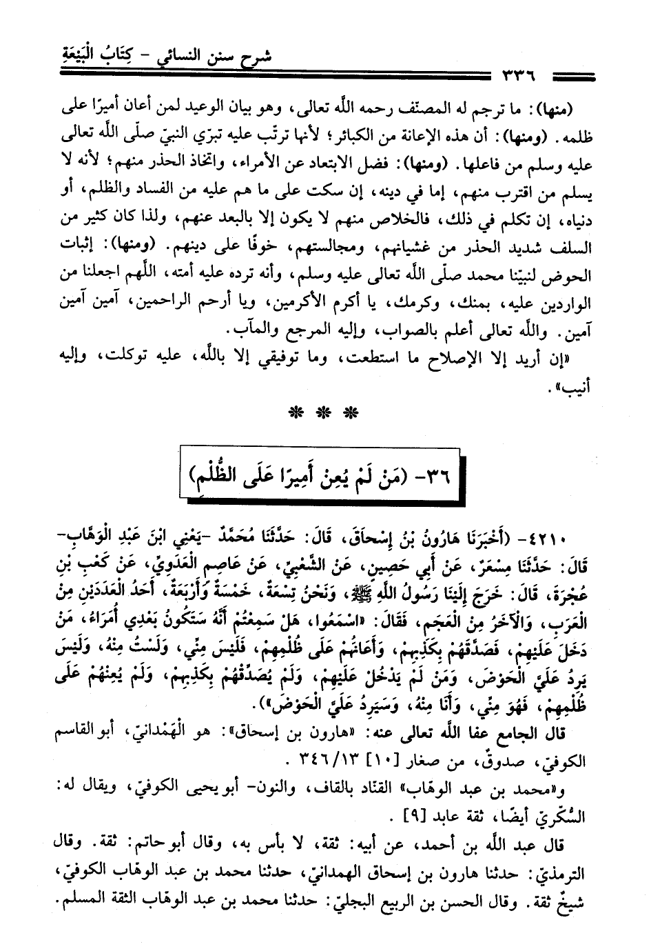 4210 - (أَخْبَرَنَا هَارُونُ بْنُ إِسْحَاقَ، قَالَ: حَدَّثَنَا مُحَمَّدٌ -يَعْنِي ابْنَ عَبْدِ الْوَهَّابِ- قَالَ: حَدَّثَنَا مِسْعَرٌ، عَنْ أَبِي حَصِينٍ، عَنِ الشَّعْبِيِّ، عَنْ عَاصِمٍ الْعَدَوِيِّ، عَنْ كَعْبِ بْنِ عُجْرَةَ، قَالَ: خَرَجَ إِلَيْنَا رَسُولُ اللَّهِ -صلى الله عليه وسلم-، وَنَحْنُ تِسْعَةٌ، خَمْسَةٌ وَأَرْبَعَةٌ، أَحَدُ الْعَدَدَيْنِ مِنَ الْعَرَبِ، وَالآخَرُ مِنَ الْعَجَمِ، فَقَالَ: "اسْمَعُوا، هَلْ سَمِعْتُمْ أَنَّهُ سَتَكُونُ بَعْدِي أُمَرَاءُ، مَنْ دَخَلَ عَلَيْهِمْ، فَصَدَّقَهُمْ بِكَذِبِهِمْ، وَأَعَانَهُمْ عَلَى ظُلْمِهِمْ، فَلَيْسَ مِنِّي، وَلَسْتُ مِنْهُ، وَلَيْسَ يَرِدُ عَلَيَّ الْحَوْضَ، وَمَنْ لَمْ يَدْخُلْ عَلَيْهِمْ، وَلَمْ يُصَدِّقْهُمْ بِكَذِبِهِمْ، وَلَمْ يُعِنْهُمْ عَلَى ظُلْمِهِمْ، فَهُوَ مِنِّي، وَأَنَا مِنْهُ، وَسَيَرِدُ عَلَيَّ الْحَوْضَ").