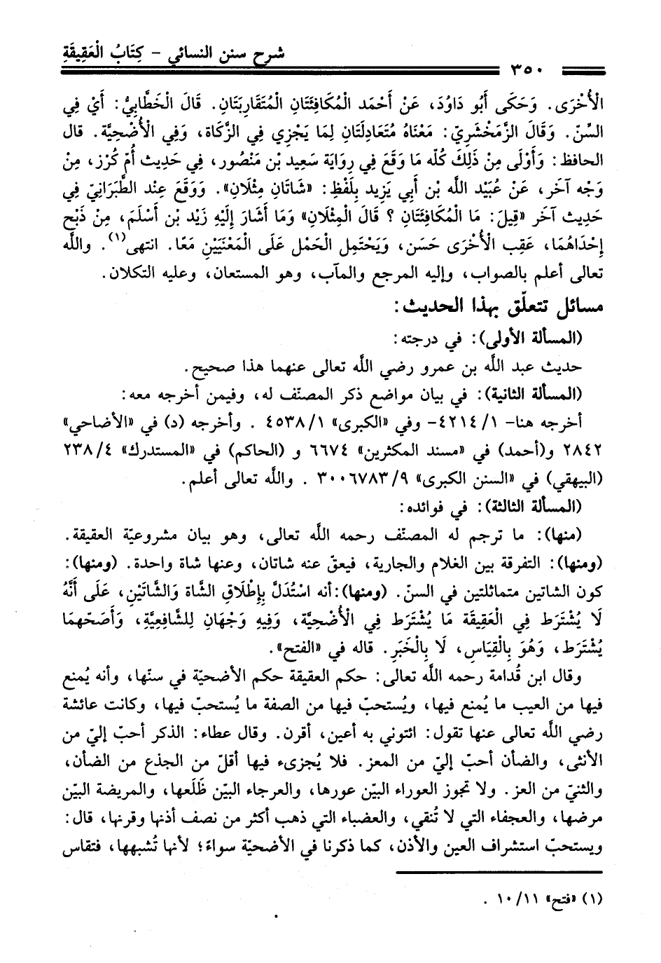 الأُخْرَى. وَحَكَى أبُو دَاوُد، عن أحمد الْمُكَافِئَتَانِ الْمُتَقَارِبَتَانِ. قَالَ الْخَطَّابِيُّ: أَيْ فِي السِّنّ. وَقَالَ الزَّمَخْشَرِيّ: مَعْنَاهُ مُتَعَادِلَتَانِ لِمَا يَجْزِي فِي الزَّكَاة، وفِي الأضْحِيَّة. قَالَ الحافظ: وأوْلى مِن ذَلِكَ كُلّه ما وقع فِي رِواية سعِيد بن منْصُور، فِي حدِيث أُمّ كُرْز، منْ وجه آخر، عن عُبيد الله بن أبِي يزِيد بلَفْظِ: "شَاتَانِ مِثْلانِ". ووقع عِنْد الطَّبَرانِيّ فِي حدِيث آخر "قِيلَ: ما الْمُكافِئتانِ؟ قال الْمِثْلانِ" وَمَا أشار إِليهِ زَيْد بْن أسْلَمْ، مِنْ ذَبْح إِحْداهُما، عقِب الأُخْرى حَسَن، وَيَحتمِل الحَمْل عَلَى المعْنَيَيْنِ معًا. انتهى (¬1). والله تعالى أعلم بالصواب، وإليه المرجع والمآب، وهو المستعان، وعليه التكلان.