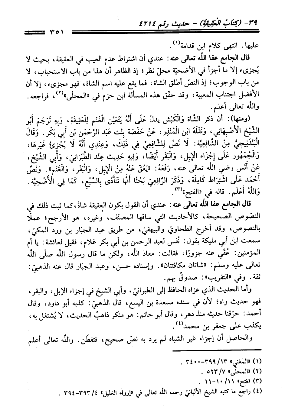 قَالَ الجامع عفا الله تعالى عنه: عندي أن اشتراط عدم العيب فِي العقيقة، بحيث لا يُجزىء إلا ما أجزأ فِي الأضحية محلّ نظر؛ إذ الظاهر أن هَذَا منْ باب الاستحباب، لا منْ باب الوجوب؛ إذ النصّ أطلق الشاة، فما يقع عليه اسم الشاة، فهو مجزىء، إلا أن الأفضل اجتناب المعيبة، وَقَدْ حقّق هذه المسألة ابن حزم فِي "المحلّى" (¬2)، فراجعه. والله تعالى أعلم.