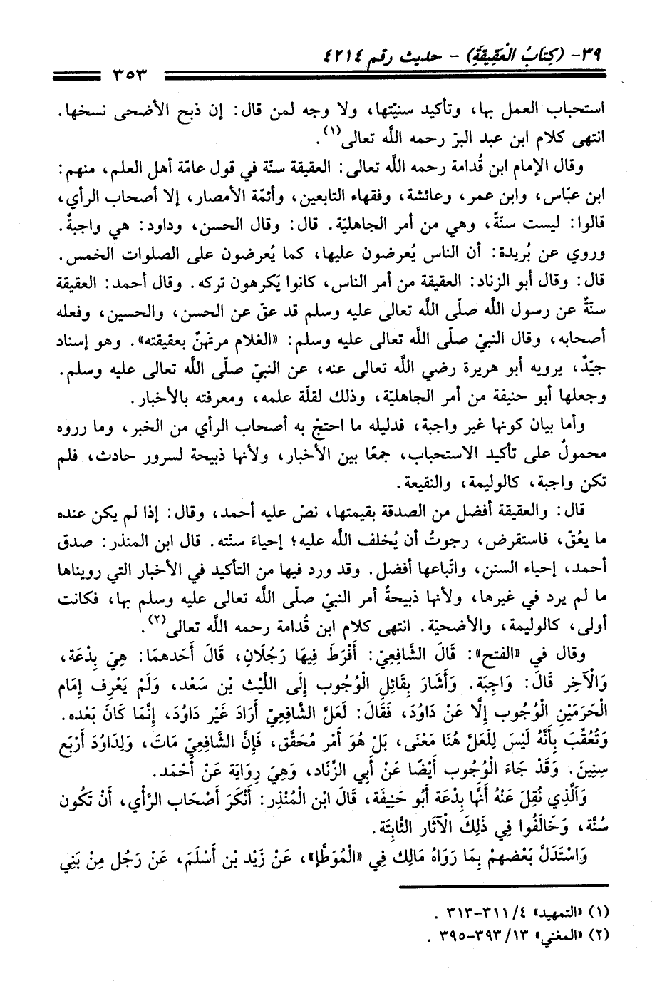 استحباب العمل بها، وتأكيد سنيّتها، ولا وجه لمن قَالَ: إن ذبح الأضحى نسخها. انتهى كلام ابن عبد البرّ رحمه الله تعالى (¬1).