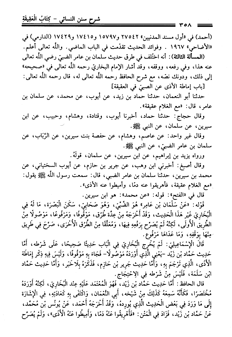 (المسألة الثالثة): أنه اختُلف فِي طرق حديث سلمان بن عامر الضبيّ رضي الله تعالى عنه هَذَا، وفي رفعه، ووقفه، وَقَدْ أشار الإِمام البخاريّ رحمه الله تعالى فِي "صحيحه" إلى ذلك، ودونك نصّه، مع شرح الحافظ رحمه الله تعالى له، قَالَ رحمه الله تعالى: [باب إماطة الأذى عن الصبيّ فِي العقيقة].