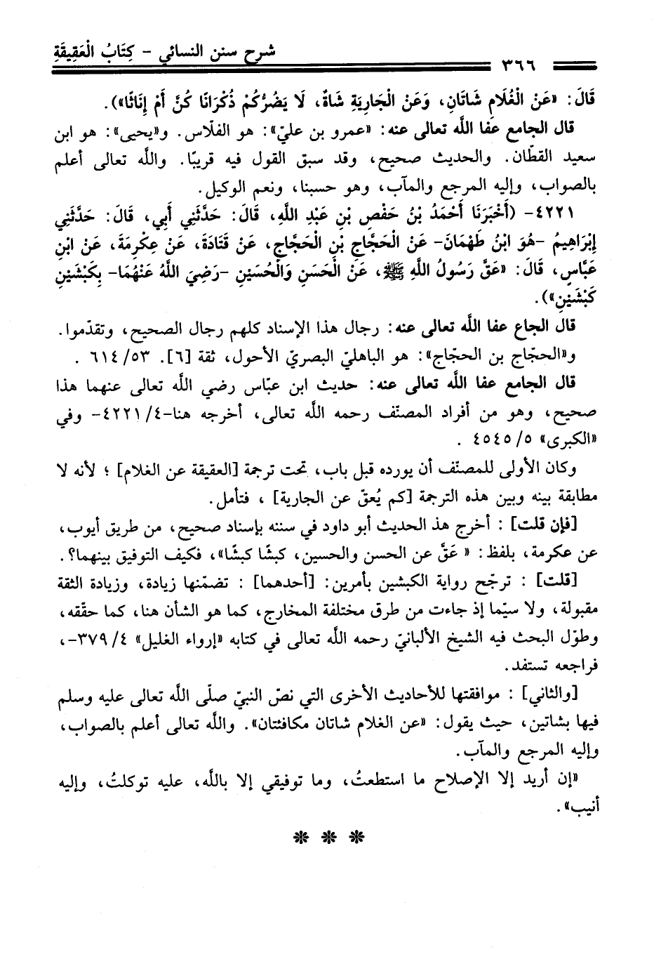 [والثاني]: موافقتها للأحاديث الأخرى التي نصّ النبيّ صلّى الله تعالى عليه وسلم فيها بشاتين، حيث يقول: "عن الغلام شاتان مكافئتان". والله تعالى أعلم بالصواب، وإليه المرجع والمآب.