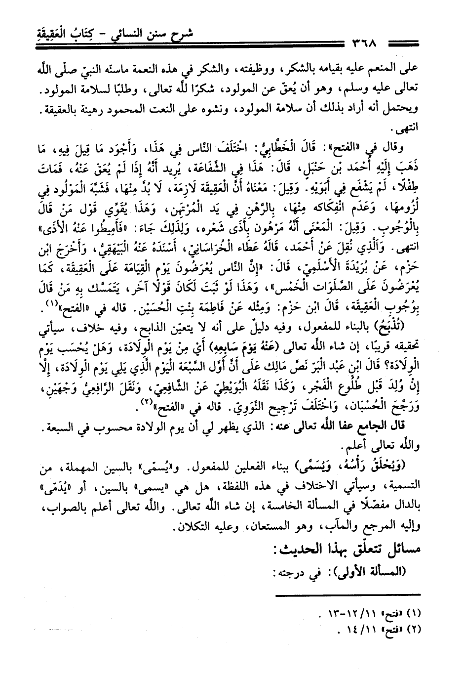 (وَيُحْلَقُ رَأْسُهُ، وَيُسَمَّى) ببناء الفعلين للمفعول. و"يُسمّى" بالسين المهملة، منْ التسمية، وسيأتي الاختلاف فِي هذه اللفظة، هل هي "يسمى" بالسين، أو "يُدَمّى" بالدال مفصّلًا فِي المسألة الخامسة، إن شاء الله تعالى. والله تعالى أعلم بالصواب، وإليه المرجع والمآب، وهو المستعان، وعليه التكلان.