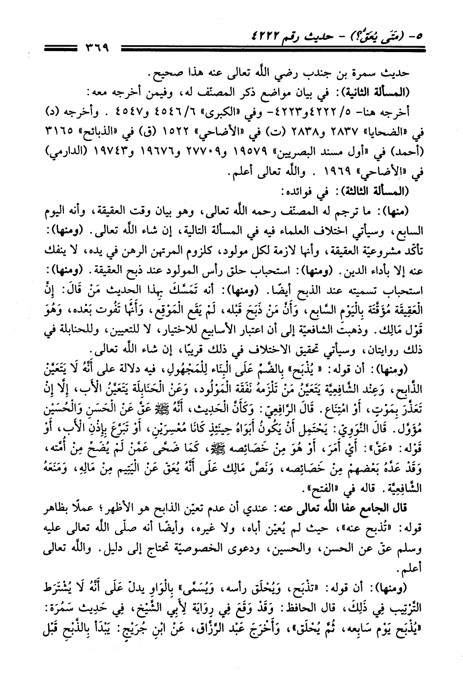 (ومنها): أن قوله: "تذْبَح، وَيُحْلَق رأسه، وَيُسَمَّى" بِالْوَاوِ يدلّ عَلَى أنَّهُ لا يُشْتَرَط التَّرتيب بني ذَلِكَ، قَالَ الحافظ: وَقَدْ وَقَعَ فِي رِواية لِأبِي الشَّيْخ، فِي حَدِيث سَمُرَة: "يُذْبح يَوْم سَابِعه، ثُمَّ يُحْلق"، وأخْرَجَ عبد الرَّزَّاق، عن ابن جُريج: يَبْدأ بِالذَّبحِ قَبْل