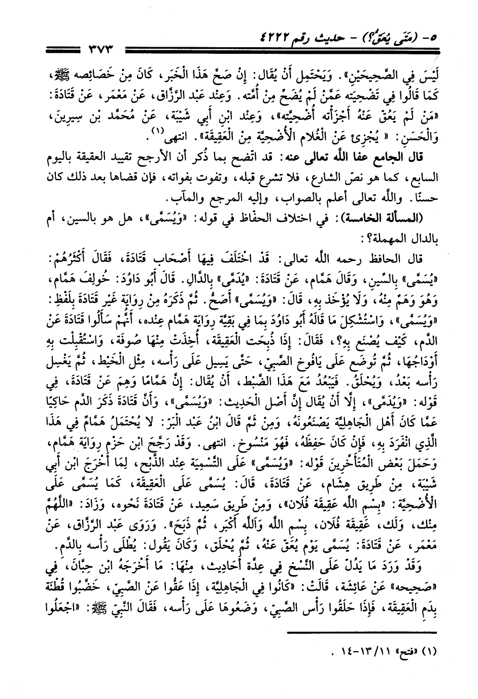 قَالَ الحافظ رحمه الله تعالى: قد اختلف فِيها أصحاب قتادة، فقال أكثرُهُم: "يُسَمَّى" بالسِّينِ، وَقَالَ هَمَّام، عن قتادة: "يُدَمَّى" بالدَّالِ. قَالَ أبُو داوُد: خُولِفَ همَّام، وهُو وَهمٌ مِنْهُ، ولا يُؤْخذ بِهِ، قَالَ: "وَيُسَّمَى" أصَحُّ. ثُمَّ ذكرهُ منْ رِواية غير قتادة بِلفظِ: "وَيُسَمَّى"، واستُشكِل ما قالهُ أبُو داوُد بِما فِي بقِيَّة رِواية همَّام عِنده، أنهم سألُوا قتادة عن الدَّم، كيف يُصنعِ بِهِ؟، فقال: إِذَا ذُبِحت العقِيقة، أُخِذتْ مِنها صُوفَة، واسْتُقبلت بِهِ أوْدَاجُها، ثُمَّ تُوضع عَلَى يَافُوخ الصَّبيّ، حَتَّى يَسِيل عَلَى رَأْسه، مِثْل الْخَيط، ثُمَّ يَغْسِل رأسه بعدُ، ويُحْلقُ. فيبعُدُ مع هَذَا الضَّبْط، أن يُقال: إِنَّ همَّامًا وهِم عن قتادة، فِي قوله: "وَيُدَمَّى"، إِلا أن يُقال إِن أصل الحدِيث: "وَيُسَمَّى"، وأنَّ قتادة ذكر الدَّم حاكِيًا عمَّا كَانَ أهل الجَاهِلِيَّة يَصْنعُونهُ، ومِن ثَمَّ قَالَ ابنُ عبد البرّ: لا يُحْتمل هَمَّامٌ فِي هَذَا الَّذِي انفرد بِهِ، فإنْ كَانَ حفِظهُ، فهُو مَنْسُوخ. انتهى. وَقَدْ رجَّح ابن حزمِ رِواية هَمَّام، وَحَمَل بَعْض المُتَأَخِّرِين قوله: "وَيُسَمَّى" عَلَى التَّسمِية عِند الذَّبح، لِما أخرج ابن أبِي شيبة، منْ طرِيق هِشَام، عن قتادة، قَالَ: يُسَمَّى عَلَى العقِيقة، كما يُسَمَّى عَلَى الأضْحِيَّة: "بِسْمِ الله عَقِيقَة فُلان"، ومِن طريق سعِيد، عَنْ قتادة نَحْوه، وزاد: "اللَّهُمَّ مِنْك، وَلَك، عَقِيقَة فُلان، بِسْمِ الله والله أكبر، ثُمَّ ذَبَح". وروى عبد الرَّزَّاق، عن معمر، عن قتادة: يُسَمَّى يوم يُعَقّ عنهُ، ثُمَّ يُحْلق، وكان يقُول: يُطْلى رأسه بِالدَّمِ.