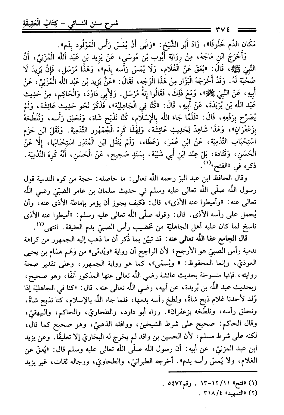 قَالَ الجامع عفا الله تعالى عنه: قد تبيّن بما ذُكر أن ما ذهب إليه الجمهور منْ كراهة تدمية رأس الصبيّ هو الأرجح؛ لأن الراجح أن رواية "ويُدمّى" منْ وَهَم همّام بن يحيى العوذيّ، وإنما المحفوظ: "وَيُسَمَّى"، كما هو رواية الجمهور، وعلى تقدير صحة روايته، فإنها منسوخة بحديث عائشة رضي الله تعالى عنها المذكور آنفًا، وهو صحيح، وبحديث عبد الله بن بُريدة، عن أبيه، رضي الله تعالى عنه، قَالَ: "كنا فِي الجاهليّة إذا وُلد لأحدنا غلام ذبح شاةً، ولطخ رأسه بدمها، فلما جاء الله بالإِسلام، كنا نذبح شاةً، ونحلق رأسه، ونلطّخه بزعفران". رواه أبو داود، والطحاويّ، والحاكم، والبيهقيّ، وَقَالَ الحاكم: صحيح عَلَى شرط الشيخين، ووافقه الذهبيّ، وهو صحيح كما قَالَ، لكنه عَلَى شرط مسلم؛ لأن الحسين بن واقد لم يخرج له البخاريّ إلا تعليقًا. وعن يزيد ابن عبد المزنيّ، عن أبيه: أن رسول الله صلّى الله تعالى عليه وسلم قَالَ: "يُعقّ عن الغلام، ولا يُمسّ رأسه بدم". أخرجه الطبرانيّ، والطحاويّ، ورجاله ثقات، غير يزيد
