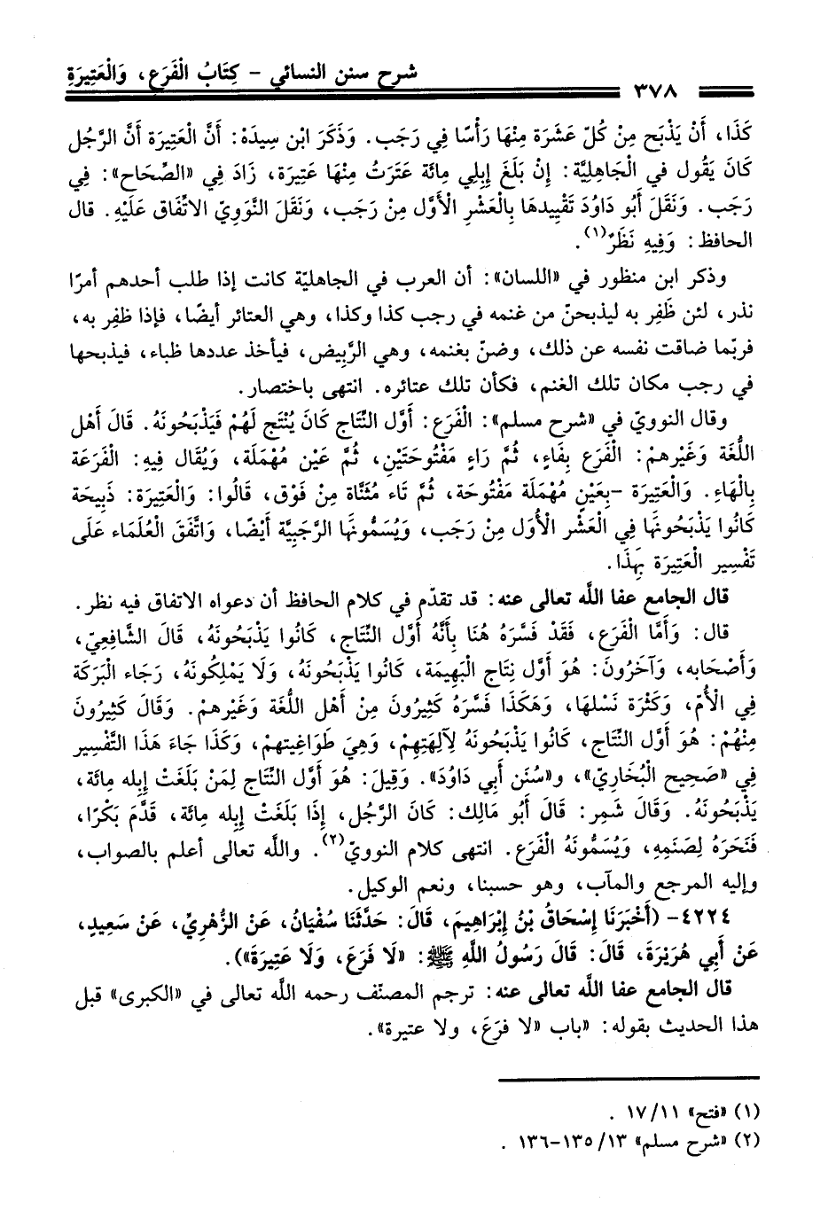 وَقَالَ النوويّ فِي "شرح مسلم": الْفَرَع: أوَّل النِّتَاج كَانَ يُنْتَج لهُمْ فيذبحُونهُ. قَالَ أهل اللُّغة وغيرهم: الْفَرَع بِفَاءٍ، ثُمّ راءٍ مفتُوحَتَيْنِ، ثُمَّ عين مُهْمَلة، وُيقال فِيهِ: الْفَرَعَة بِالهاءِ. والْعتِيرَة -بِعينِ مُهملة مَفْتُوحة، ثُمَّ تَاء مُثَنَّاة منْ فَوْق، قَالُوا: والْعَتِيرة: ذَبِيحَة كانُوا يَذْبحُونَهَا فِي العشر الأُول مِنْ رَجَب، وَيُسَمُونها الرَّجَبِيَّة أيضًا، واتَّفَق العُلَمَاء عَلَى تَفْسِير العَتِيرة بِهذا.
