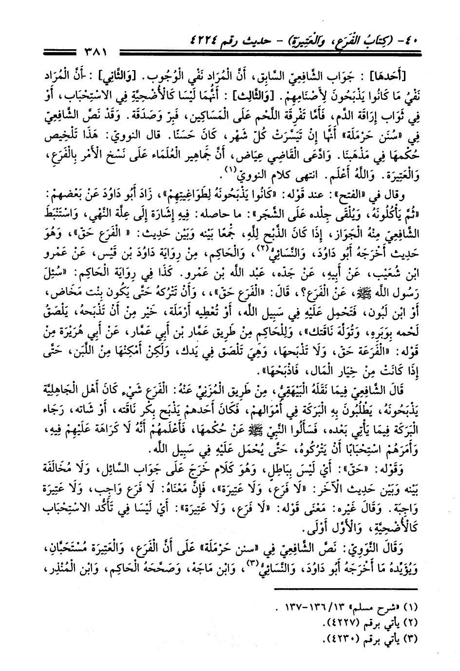 [أَحَدهَا]: جَواب الشَّافِعِيّ السَّابِق، أن الْمُرَاد نفي الْوُجُوب. [والثَّانِي]: أن الْمُرَاد نَفْيُ ما كانُوا يذْبَحُون لِأصْنَامِهِمْ. [والثَّالِث]: أنَّهُما لَيْسَا كالأضْحِيَّةِ فِي الاسْتِحْباب، أو فِي ثوَاب إِراقة الدَّم، فأمَّا تفرِقة اللَّحم عَلَى المَسَاكِين، فبِرّ وَصَدَقة. وَقَدْ نَصَّ الشَّافِعِيّ فِي "سُنَن حرملة" أَنَّها إن تيسَّرتْ كُلّ شَهْر، كَانَ حَسَنًا. قَالَ النوويّ: هَذَا تَلْخِيص حُكْمهَا فِي مَذْهَبنَا. وادَّعَى القَاضِي عِيَاض، أنَّ جمَاهِير العُلَمَاء عَلَى نَسْخ الْأَمْر بِالْفَرَعِ، والْعَتِيرَة. واللهُ أعْلم. انتهى كلام النوويّ (¬1).