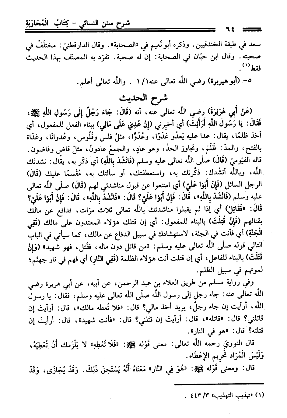 (عَنْ أبِي هُرَيْرَة) - رضي اللَّه تعالى عنه -، أنه (قَالَ: جَاءَ رَجُلٌ إِلَى رَسُولِ اللَّهِ - صلى اللَّه عليه وسلم -، فَقَالَ: يَا رَسُول اللَّهِ أَرَأَيْتَ) أي أخبِرني (إِنْ عُدِي عَلَى مَالِي) ببناء الفعل للمفعول، أي أخذ ظلمّا، يقال: عدا عليه يعدُو عدْوْا، وعُدُوْا، مثلُ فلس وفُلُوس، وعُدوانًا، وعَدَاءً بالفتح، والمدّ: ظَلَمَ، وتجاوز الحدَّ، وهو عاب، والجمعُ عادونَ، مثلُ قاضٍ وقاضون. قاله الفيّوميّ (قَالَ) - صلى اللَّه تعالى عليه وسلم - (فَانْشُدْ بِاللَّهِ) أي ذكر به، يقال: نشدتك اللَّه، وباللَّه أنشُدك: ذكرتك به، واستعطفتك، أو سألتك به، مُقسمّا عليك (قَالَ) الرجل السائل (فَإِنْ أَبَوْا عَلَيَّ) أي امتنعوا عن قبول مناشدتي لهم (قَالَ) - صلى اللَّه تعالى عليه وسلم - (فَانْشُدْ بِاللَّهِ"، قال: فإن أبوْا على؛ قال: (فَانْشُدْ بِاللَّهِ"، قَالَ: فَإِنْ أَبَوْا عَلَيَّ؟ قال: "فَقَاتِلْ) أي إذا لم يقبلوا مناشدتك باللَّه تعالى ثلاث مرّات، فدافع عن مالك بقتالهم (فَإنْ قُتِلْتَ) بالبناء للمفعول: أي إن قتلك هؤلاء المعتدون على مالك (فَفِي الْجَنَّةِ) أي فأنت في الجنّة، لاستهشادك في سبيل الدفاع عن مالك، كما سيأتي في الباب التالي قوله - صلى اللَّه تعالى عليه وسلم -: "من قاتل دون ماله، فقُتل، فهو شهيد" (وَإِنْ قَتَلْتَ) بالبناء للفاعل، أي إن قتلت أنت هوْلاء الظلمة (فَفِي النَّارِ) أي فهم في نار جهنّم؛ لموتهم في سبيل الظلم.