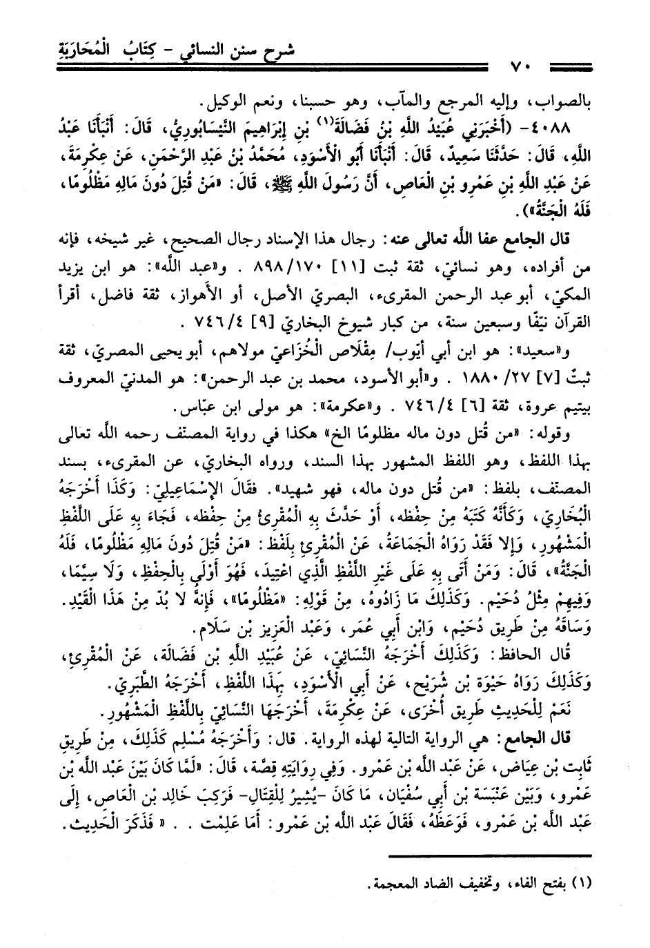 4088 - (أَخْبَرَنِي عُبَيْدُ اللَّهِ بْنُ فَضَالَةَ (¬1) بْنِ إِبْرَاهِيمَ النَّيْسَابُورِيُّ, قَالَ: أَنْبَأَنَا عَبْدُ اللَّهِ, قَالَ: حَدَّثَنَا سَعِيدٌ, قَالَ: أَنْبَأَنَا أَبُو الأَسْوَدِ, مُحَمَّدُ بْنُ عَبْدِ الرَّحْمَنِ, عَنْ عِكْرِمَةَ, عَنْ عَبْدِ اللَّهِ بْنِ عَمْرِو بْنِ الْعَاصِ, أَنَّ رَسُولَ اللَّهِ - صلى اللَّه عليه وسلم -, قَالَ: «مَنْ قُتِلَ دُونَ مَالِهِ مَظْلُومًا, فَلَهُ الْجَنَّةُ»).