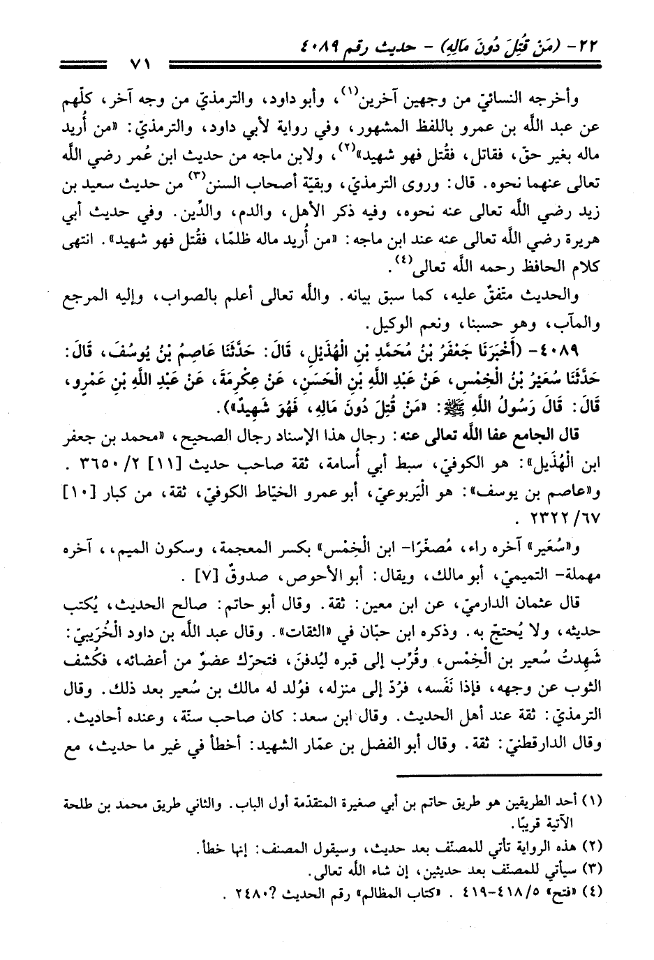4089 - (أَخْبَرَنَا جَعْفَرُ بْنُ مُحَمَّدِ بْنِ الْهُذَيْلِ, قَالَ: حَدَّثَنَا عَاصِمُ بْنُ يُوسُفَ, قَالَ: حَدَّثَنَا سُعَيْرُ بْنُ الْخِمْسِ, عَنْ عَبْدِ اللَّهِ بْنِ الْحَسَنِ, عَنْ عِكْرِمَةَ, عَنْ عَبْدِ اللَّهِ بْنِ عَمْرٍو, قَالَ: قَالَ رَسُولُ اللَّهِ - صلى اللَّه عليه وسلم -: «مَنْ قُتِلَ دُونَ مَالِهِ, فَهُوَ شَهِيدٌ»).