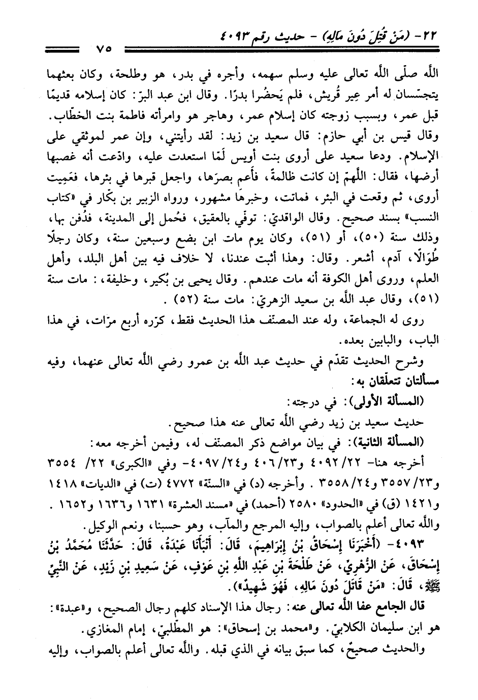 4093 - (أَخْبَرَنَا إِسْحَاقُ بْنُ إِبْرَاهِيمَ, قَالَ: أَنْبَأَنَا عَبْدَةُ, قَالَ: حَدَّثَنَا مُحَمَّدُ بْنُ إِسْحَاقَ, عَنِ الزُّهْرِيِّ, عَنْ طَلْحَةَ بْنِ عَبْدِ اللَّهِ بْنِ عَوْفٍ, عَنْ سَعِيدِ بْنِ زَيْدٍ, عَنِ النَّبِيِّ - صلى اللَّه عليه وسلم - قَالَ: «مَنْ قَاتَلَ دُونَ مَالِهِ, فَهُوَ شَهِيدٌ»).