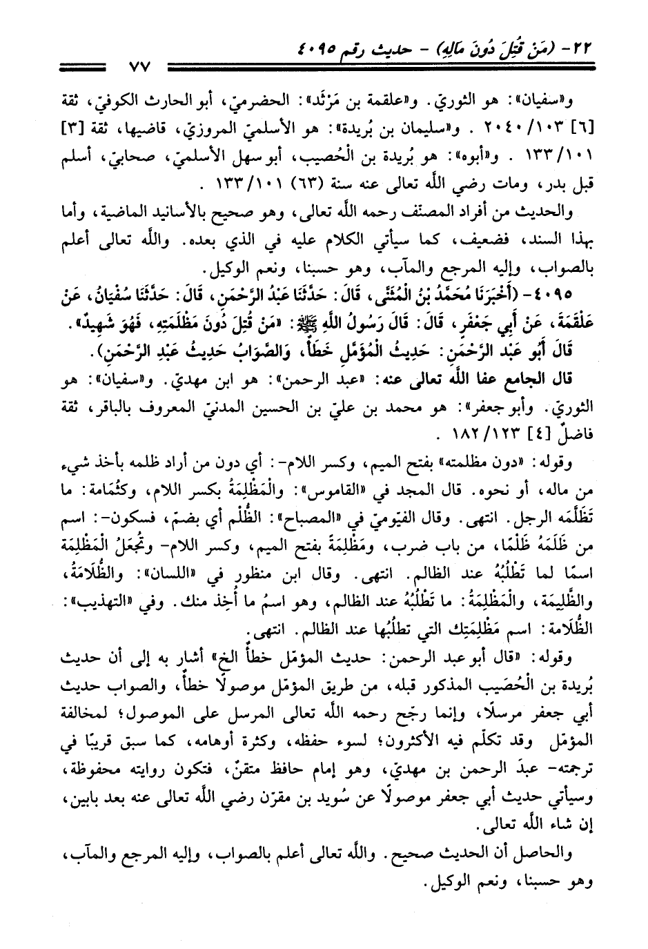 4095 - (أَخْبَرَنَا مُحَمَّدُ بْنُ الْمُثَنَّى, قَالَ: حَدَّثَنَا عَبْدُ الرَّحْمَنِ, قَالَ: حَدَّثَنَا سُفْيَانُ, عَنْ عَلْقَمَةَ, عَنْ أَبِي جَعْفَرٍ, قَالَ: قَالَ رَسُولُ اللَّهِ - صلى اللَّه عليه وسلم -: «مَنْ قُتِلَ دُونَ مَظْلَمَتِهِ, فَهُوَ شَهِيدٌ». قَالَ أَبُو عَبْدِ الرَّحْمَنِ: حَدِيثُ الْمُؤَمَّلِ خَطَأٌ, وَالصَّوَابُ حَدِيثُ عَبْدِ الرَّحْمَنِ).