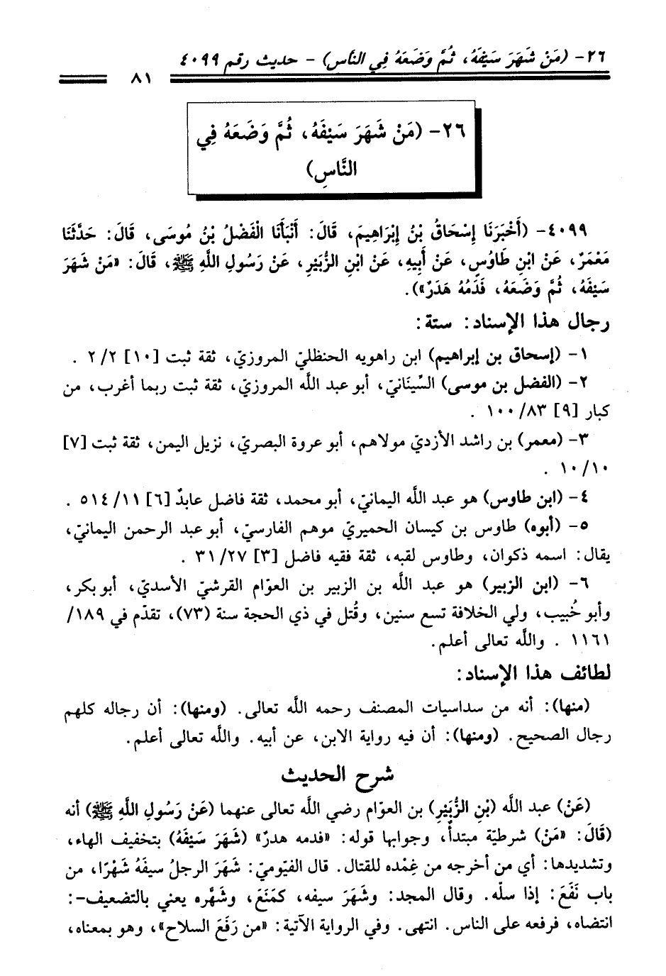 4099 - (أَخْبَرَنَا إِسْحَاقُ بْنُ إِبْرَاهِيمَ, قَالَ: أَنْبَأَنَا الْفَضْلُ بْنُ مُوسَى, قَالَ: حَدَّثَنَا مَعْمَرٌ, عَنِ ابْنِ طَاوُسٍ, عَنْ أَبِيهِ, عَنِ ابْنِ الزُّبَيْرِ, عَنْ رَسُولِ اللَّهِ - صلى اللَّه عليه وسلم -, قَالَ: «مَنْ شَهَرَ سَيْفَهُ, ثُمَّ وَضَعَهُ, فَدَمُهُ هَدَرٌ»).