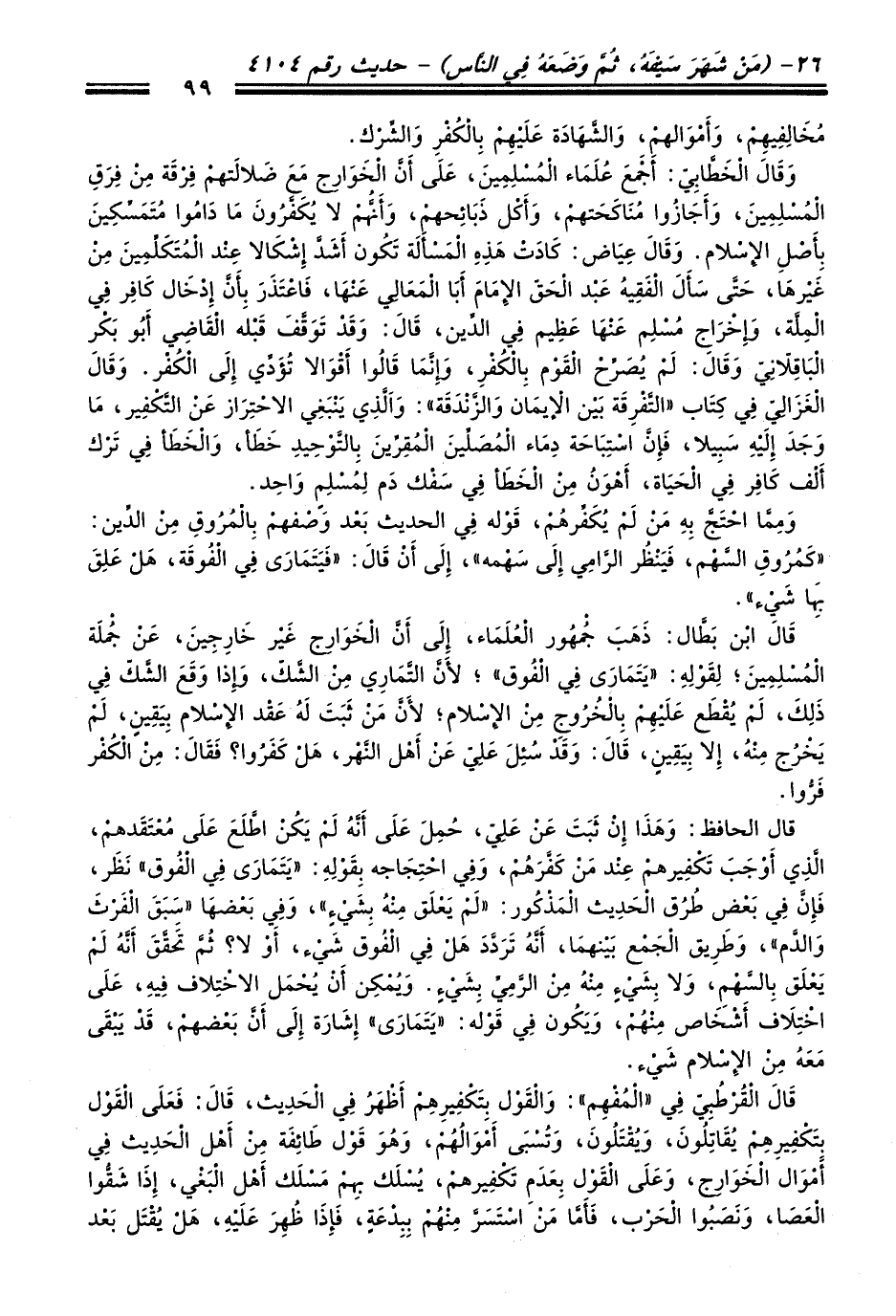 قال ابن بطَّال: ذهب جُهُور العُلماء، إلى أنَّ الخوارج غير خارِجِين، عن جملة المُسلمِينَ؛ لِقوْلِهِ: "يتمارى في الْفُوق"؛ لأنَّ التَّمارِي من الشَّك، لمِاذا وقع الشَّكّ في ذَلِكَ، لم يُقطع عليهِم بِالخرُوجِ من الإسلام؛ لأنَّ من ثبت لهُ عقد الإسلام بِيقِينِ، لم يخرُج مِنهُ، إِلا بِيقِين، قال: وقد سُئِل علِي عن أهل النَّهر، هل كفرُوا؟ فقال: من الكُفر فرُّوا.