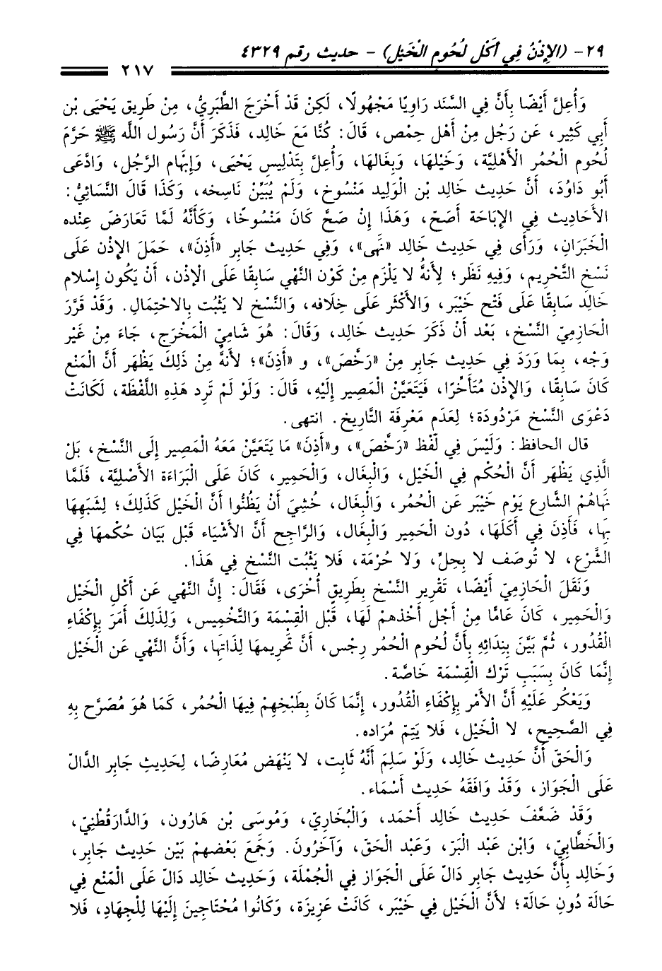 وَأُعِلَّ أَيْضًا بِأنَّ فِي السَّنَد رَاوِيًا مَجْهُولاً، لَكِنْ قَدْ أَخرَجَ الطَّبرِيُّ، طَرِيق يَحْيَى بْن أَبِي كَثِير، عَن رَجُل منْ أَهْل حِمْص، قَالَ: كُنَّا مَعَ خَالِد، فَذَكَرَ أَنَّ رَسُول الله -صلى الله عليه وسلم- حَرَّمَ لُحُوم الْحُمُر الأَهْليَّة، وَخَيْلهَا، وَبِغَالهَا، وَأُعِلَّ بِتَدْلِيسِ يَحْيَى، وإبْهَام الرَّجُل، وَادَّعَى أَبُو دَاوُدَ، أَنَّ حَدِيث خَالِد بن الْوَلِيد مَنْسُوخ، وَلَمْ يُبَيِّن نَاسِخه، وَكَذَا قَالَ النَّسَائِيُّ: الأَحَادِيث فِي الإِبَاحَة أَصَحّ، وَهَذَا إِنْ صَحَّ كَانَ مَنْسُوخًا، وَكَأنَّهُ لَمَّا تَعَارَضَ عِنْده الْخَبَرَانِ، وَرَأَى فِي حَدِيث خَالِد "نَهَى"، وَفِي حَدِيث جَابِر "أَذِنَ"، حَمَلَ الإذْن عَلَى نَسْخ التَّحْرِيم، وَفِيهِ نَظَر؛ لِأَنَّهُ لا يَلْزَم منْ كَوْن النَّهْي سَابقًا عَلَى الإذْن، أنْ يَكُون إِسْلام خَالَد سَابِقًا عَلَى فَتْح خَيْبَر، وَالأَكْثَر عَلَى خِلَافه، وَالنَّسْخَ لا يَثْبُت بالاحْتِمَال. وَقَدْ قَرَّرَ الْحَازِمِيّ النَّسْخ، بَعْد أنْ ذَكَرَ حَدِيث خَالِد، وَقَالَ: هُوَ شَامِيّ الْمَخْرَج، جَاءَ منْ غَيْر وَجْه، بِمَا وَرَدَ فِي حَدِيث جَابِر مِنْ "رَخَّصَ"، و"أَذِنَ"؛ لأَنَّه منْ ذَلِكَ يَظْهَر أَنَّ الْمَنْع كَانَ سَابِقًا، وَالإذْن مُتَأخِّرًا، فَيَتَعَيَّن المَصِير إِلَيْهِ، قَالَ: وَلَوْ لَمْ تَرِد هَذِهِ اللَّفْظَة، لَكَانَتْ دَعْوَى النَّسْخ مَرْدُودَة؛ لِعَدَم مَعْرِفَة التَّارِيخ. انتهى.