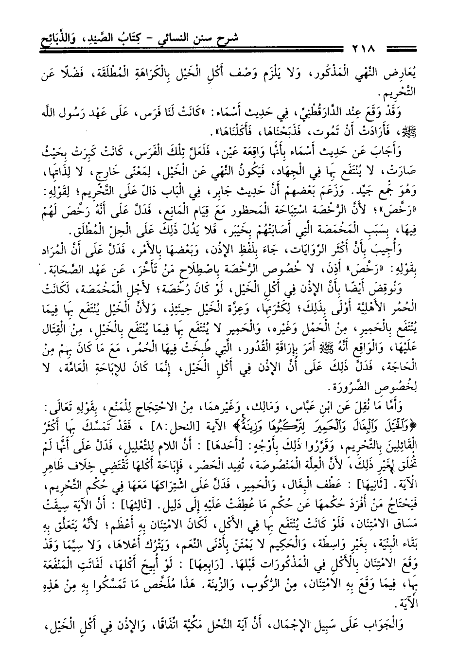 وَأَجَابَ عَن حَدِيث أَسْمَاء بأَنَّهَا وَاقِعَة عَيْن، فَلَعَلَّ تِلْكَ الفَرَس، كَانَتْ كَبِرَت بحَيْثُ صَارَتْ، لا يُنْتَفَع بهِا فِي الْجِهَاد، فَيَكُونُ النَّهْي عَن الْخَيْل، لِمَعْنًى خَارج، لا لِذَاتِهَا، وَهُوَ جَمْع جَيِّد. وَزَعَمَ بَعْضهمْ أنَّ حَدِيث جَابِر، فِي الْبَاب دَالّ عَلَى التَّحْرِيم؛ لِقَولِهِ: "رَخَّصَ"؛ لأَنَّ الرُّخْصَة اسْتِبَاحَة الْمَحظور مَعَ قِيَام المَانِع، فَدَلَّ عَلَى أَنَّهُ رَخَّصَ لَهُمْ فِيهَا، بِسَبَب المَخْمَصَة الَّتِي أَصَابَتْهُمْ بِخَيْبَر، فَلا يَدُلّ ذَلِكَ عَلَى الحِلّ الْمُطْلَق.