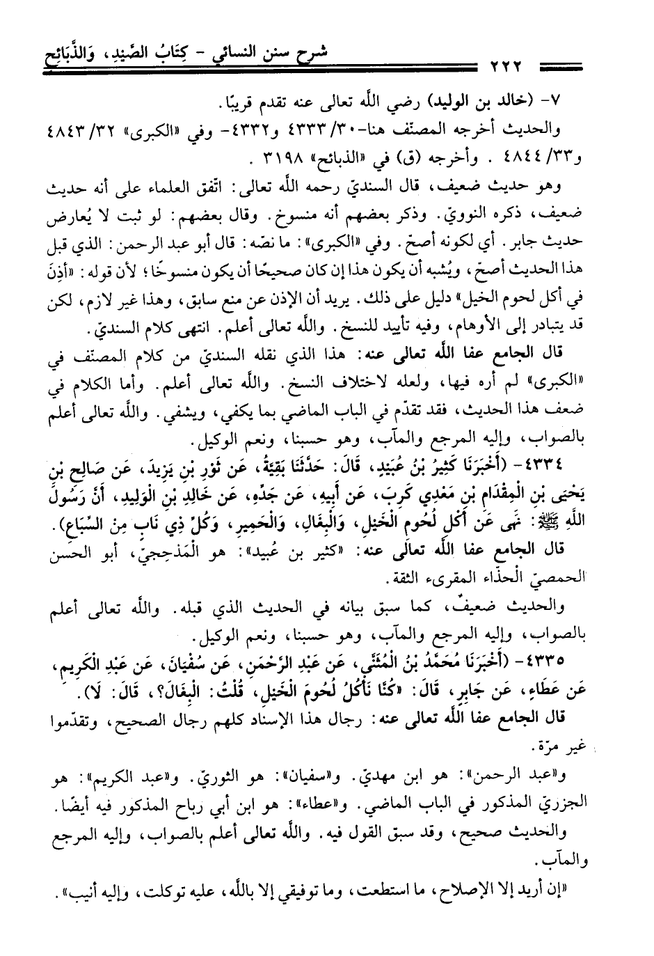 قَالَ الجامع عفا الله تعالى عنه: هَذَا الذي نقده السنديّ منْ كلام المصنّف فِي "الكبرى" لم أره فيها، ولعله لاختلاف النسخ. والله تعالى أعلم. وأما الكلام فِي ضعف هَذَا الْحَدِيث، فقد تقدّم فِي الباب الماضي بما يكفي، ويشفي. والله تعالى أعلم بالصواب، وإليه المرجع والمآب، وهو حسبنا، ونعم الوكيل.