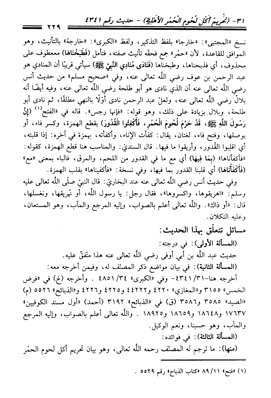نسخ "المجتبى": "خارجا" بلفظ التذكير، ولفظ "الكبرى": "خارجة" بالتأنيث، وهو الموافق للقاعدة؛ لأن "حمُر" جمع فحقّه تأنيث صفته، فتأمل (فَطَبَخْنَاهَا) معطوف عَلَى محذوف، أي فذبحناها، وطبخناها (فَنَادَى مُنَادِي النَّبِيِّ -صلى الله عليه وسلم-) سيأتي قريبًا أن المنادي هو عبد الرحمن بن عوف رضي الله تعالى عنه، وفي "صحيح مسلم" منْ حديث أنس رضي الله تعالى عنه أن الذي نادى هو أبو طلحة رضي الله تعالى عنه، وفيه أيضًا أنه بلالٌ رضي الله تعالى عنه، ولعلّ عبد الرحمن نادى أوّلًا بالنهي مطلقًا، ثم نادى أبو طلحة، وبلال بزيادة عَلَى ذلك، وهو قوله: "فإنها رجس". قاله فِي "الفتح" (¬1) (إِنَّ رَسُولَ اللَّهِ -صلى الله عليه وسلم-، قَدْ حَرَّمَ لُحُومَ الْحُمُرِ، فَأَكْفِئُوا الْقُدُورَ) بقطع الهمزة، وكسر فاء، أو بوصلها، وفتح فاء، لغتان، يقال: كفأت الإناء، وأكفأته، بهمزة فِي آخره: إذا قلبته، أي اقلِبوا القُدور، وأريقوا ما فيها. قَالَ السنديّ: والمناسب هنا قطع الهمزة، كقوله: "فأكفأْناها" (بِمَا فِيهَا) أي مع ما فِي القدور منْ اللحم، والمرق، فالباء بمعنى "مع" (فَأَكْفَأْنَاهَا) أي قلبنا القدور بما فيها، وفي نسخة: "فأكفيناها" بقلب الهمزة.