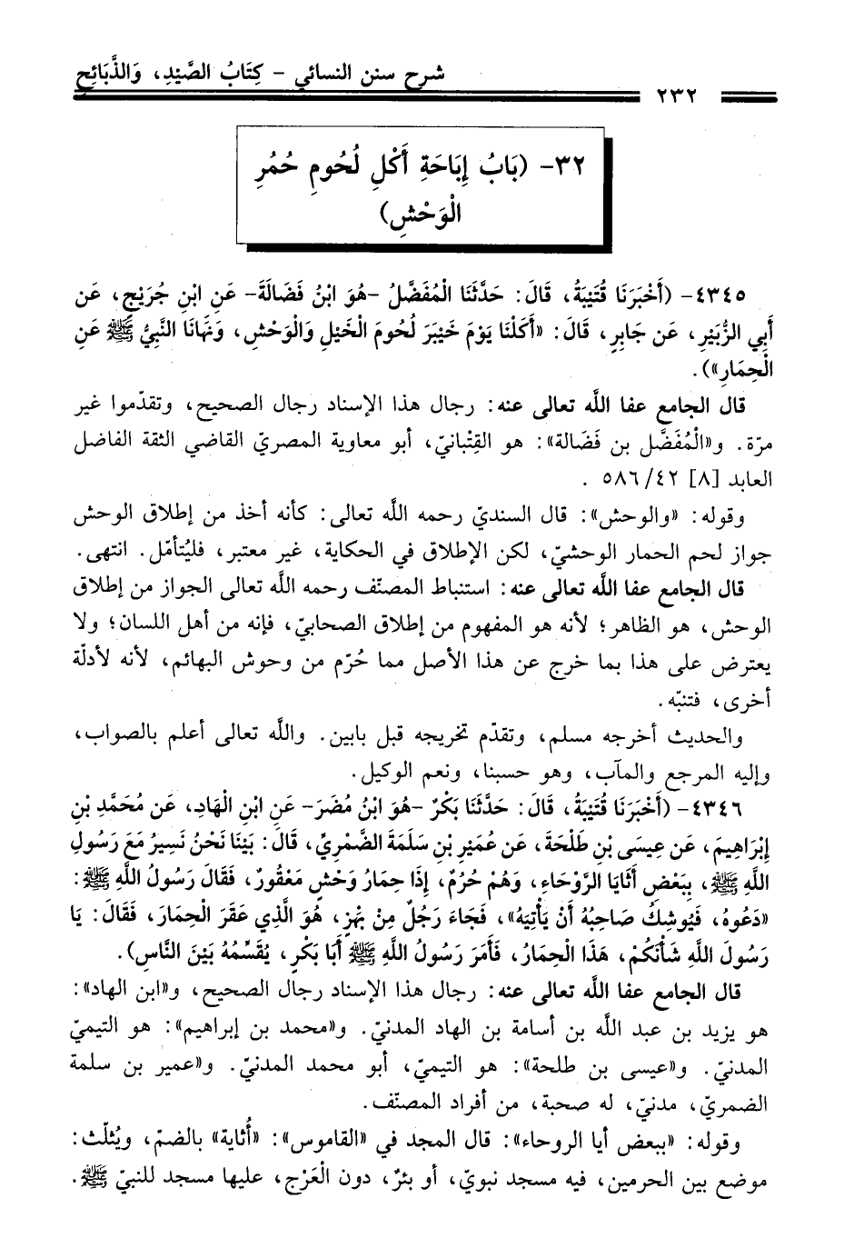 4345 - (أَخْبَرَنَا قُتَيْبَةُ، قَالَ: حَدَّثَنَا الْمُفَضَّلُ -هُوَ ابْنُ فَضَالَةَ- عَنِ ابْنِ جُرَيْجٍ، عَنْ أَبِي الزُّبَيْرِ، عَنْ جَابِرٍ، قَالَ: "أَكَلْنَا يَوْمَ خَيْبَرَ لُحُومَ الْخَيْلِ وَالْوَحْشِ، وَنَهَانَا النَّبِيُّ -صلى الله عليه وسلم- عَنِ الْحِمَارِ").