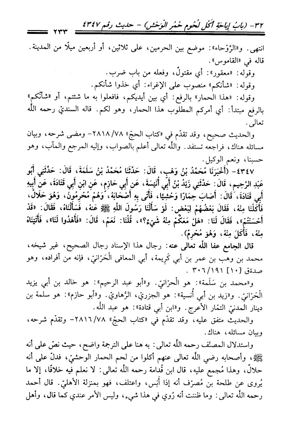 4347 - (أَخْبَرَنَا مُحَمَّدُ بْنُ وَهْبٍ، قَالَ: حَدَّثَنَا مُحَمَّدُ بْنُ سَلَمَةَ، قَالَ: حَدَّثَنِي أَبُو عَبْدِ الرَّحِيمِ، قَالَ: حَدَّثَنِي زَيْدُ بْنُ أَبِي أُنَيْسَةَ، عَنْ أَبِي حَازِمٍ، عَنِ ابْنِ أَبِي قَتَادَةَ، عَنْ أَبِيهِ أَبِي قَتَادَةَ، قَالَ: أَصَابَ حِمَارًا وَحْشِيًّا، فَأَتَى بِهِ أَصْحَابَهُ، وَهُمْ مُحْرِمُونَ، وَهُوَ حَلاَلٌ، فَأَكَلْنَا مِنْهُ، فَقَالَ بَعْضُهُمْ لِبَعْضٍ: لَوْ سَأَلْنَا رَسُولَ اللَّهِ -صلى الله عليه وسلم- عَنْهُ، فَسَأَلْنَاهُ، فَقَالَ: "قَدْ أَحْسَنْتُمْ"، فَقَالَ لَنَا: "هَلْ مَعَكُمْ مِنْهُ شَيْءٌ؟ "، قُلْنَا: نَعَمْ، قَالَ: "فَاهْدُوا لَنَا"، فَأَتَيْنَاهُ مِنْهُ، فَأَكَلَ مِنْهُ، وَهُوَ مُحْرِمٌ).