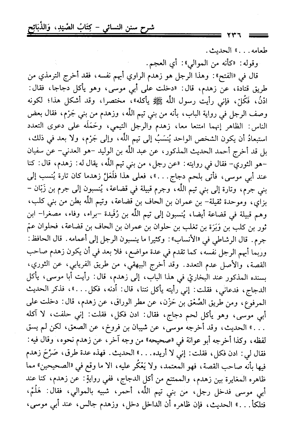 قَالَ فِي "الفتح": وهذا الرجل هو زهدم الراوي أبهم نفسه، فقد أخرج الترمذي منْ طريق قتادة، عن زهدم، قَالَ: "دخلت عَلَى أبي موسى، وهو يأكل دجاجا، فَقَالَ: ادْنُ، فَكُلْ، فإني رأيت رسول الله -صلى الله عليه وسلم- يأكله"، مختصرا، وَقَدْ أشكل هَذَا؛ لكونه وصف الرجل فِي رواية الباب، بأنه منْ بني تيم الله، وزهدم منْ بني جَرْم، فَقَالَ بعض النَّاس: الظاهر إنهما امتنعا معا، زهدم والرجل التيمي، وحَمَلَه عَلَى دعوى التعدد استبعادُ أن يكون الشخص الواحد يُنسَبُ إلى تيم الله، وإلى جَرْم، ولا بعد فِي ذلك، بل قد أخرج أحمد الْحَدِيث المذكور، عن عبد الله بن الوليد -هو العدني- عن سفيان -هو الثوري- فَقَالَ فِي روايته: "عن رجل، منْ بني تيم الله، يقال له: زهدم، قَالَ: كنا عند أبي موسى، فأتى بلحم دجاج ... "، فعلى هَذَا فلَعَلَّ زهدم، كَانَ تارة يُنسب إلى بني جرم، وتارة إلى بني تيم الله، وجرم قبيلة فِي قضاعة، يُنسبون إلى جرم بن زَبَّان -بزاي، وموحدة ثقيلة- بن عمران بن الحاف بن قضاعة، وتيم الله بطن منْ بني كلب، وهم قبيلة فِي قضاعة أيضاً، يُنسبون إلى تيم الله بن رُفَيدة -براء، وفاء، مصغرا- ابن ثور بن كلب بن وَبَرَة بن تغلب بن حلوان بن عمران بن الحاف بن قضاعة، فحلوان عمّ جرم. قَالَ الرشاطي فِي "الأنساب": وكثيرا ما ينسبون الرجل إلى أعمامه. قَالَ الحافظ: وربما أبهم الرجل نفسه، كما تقدم فِي عدة مواضع، فلا بعد فِي أن يكون زهدم صاحب القصة، والأصل عدم التعدد. وَقَدْ أخرج البيهقي، منْ طريق الفريابي، عن الثوري، بسنده المذكور عند البخاريّ فِي هَذَا الباب، إلى زهدم، قَالَ: رأيت أبا موسى، يأكل الدجاج، فدعاني، فقلت: إني رأيته يأكل نتنا، قَالَ: ادنه، فكل ... "، فذكر الْحَدِيث المرفوع، ومن طريق الصَّعْق بن حَزْن، عن مطر الوراق، عن زهدم، قَالَ: دخلت عَلَى أبي موسى، وهو يأكل لحم دجاج، فَقَالَ: ادن فكل، فقلت: إني حلفت، لا آكله ... " الْحَدِيث، وَقَدْ أخرجه موسى، عن شيبان بن فروخ، عن الصعق، لكن لم يسق لفظه، وكذا أخرجه أبو عوانة فِي "صحيحه" منْ وجه آخر، عن زهدم نحوه، وَقَالَ فيه: فَقَالَ لي: ادن فكل، فقلت: إني لا أريده ... " الْحَدِيث. فهذه عدة طرق، صَرَّحَ زهدم فيها بأنه صاحب القصة، فهو المعتمد، ولا يَعْكُر عليه، إلا ما وقع فِي "الصحيحين" مما ظاهره المغايرة بين زهدم، والممتنع منْ أكل الدجاج، ففي روايةٍ: عن زهدم، كنا عند أبي موسى فدخل رجل، منْ بني تيم الله، أحمر، شبيه بالموالي، فَقَالَ: هَلُمَّ، فتلكأ ... " الْحَدِيث، فإن ظاهره أن الداخل دخل، وزهدم جالس، عند أبي موسى،