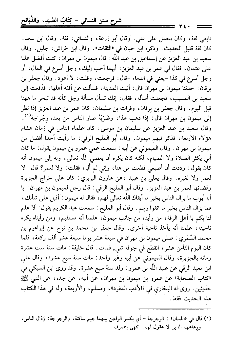 تابعيّ ثقة، وكان يحمل عَلَى علي. وَقَالَ أبو زرعة، والنسائي: ثقة. وَقَالَ ابن سعد: كَانَ ثقة قليل الْحَدِيث. وذكره ابن حبّان فِي "الثقات". وَقَالَ ابن خراش: جليل. وَقَالَ سعيد بن عبد العزيز عن إسماعيل بن عبد الله: قَالَ ميمون بن مهران: كنت أفضل عليا عَلَى عثمان، فَقَالَ لي عمر بن عبد العزيز: أيهما أحب إليك، رجل أسرع فِي المال، أو رجل أسرع فِي كذا -يعني فِي الدماء- قَالَ: فرجعت، وقلت: لا أعود. وَقَالَ جعفر بن برقان: حدثنا ميمون بن مهران قَالَ: أتيت المدينة، فسألت عن أفقه أهلها، فدُفعت إلى سعيد بن المسيب، فجعلت أسأله، فَقَالَ: إنك تسأل مسألة رجل كأنه قد تبحر ما هاهنا قبل اليوم. وَقَالَ جعفر بن برقان، وفرات بن سليمان: كَانَ عمر بن عبد العزيز إذا نظر إلى ميمون بن مهران قَالَ: إذا ذهب هَذَا، وضَرْبُهُ صار النَّاس منْ بعده رِجْراجة (¬1). وَقَالَ سعيد بن عبد العزيز عن سليمان بن موسى: كَانَ علماء النَّاس فِي زمان هشام هؤلاء الأربعة، فذكر فيهم ميمون. وَقَالَ أبو المليح الرقي: ما رأيت أحدا أفضل منْ ميمون بن مهران. وَقَالَ الميموني عن أبيه: سمعت عمي عمرو بن ميمون يقول: ما كَانَ أبي يكثر الصلاة ولا الصيام، لكنه كَانَ يكره أن يعصي الله تعالى، وبه إلى ميمون أنه كَانَ يقول: وددت أن أصبعي قطعت منْ هنا، وإني لم أَلِ، فقلت: ولا لعمر؟ قَالَ: لا لعمر ولا لغيره. وَقَالَ يعلي بن عبيد، عن هارون البربري: كَانَ عَلَى خراج الجزيرة وقضائها لعمر بن عبد العزيز. وَقَالَ أبو المليح الرقي: قَالَ رجل لميمون بن مهران: يا أبا أيوب ما يزال النَّاس بخير ما أبقاك الله تعالى لهم، فَقَالَ له ميمون: أقبل عَلَى شأنك، فما يزال النَّاس بخير ما اتقوا ربهم. وَقَالَ أبو المليح: سمعت عبد الكريم يقول: لا علم لنا بكم يا أهل الرقة، منْ رأيناه منْ جانب ميمون، علمنا أنه مستقيم، ومن رأيناه يكره ناحيته، علمنا أنه يأخذ ناحية أخرى. وَقَالَ جعفر بن محمد بن نوح عن إبراهيم بن محمد السَّمَّري: صلى ميمون بن مهران فِي سبعة عشر يوما سبعة عشر ألف ركعة، فلما كَانَ اليوم الثامن عشر، انقطع فِي جوفه شيء فمات. قَالَ خليفة: مات سنة ست عشرة ومائة بالجزيرة، وَقَالَ الميموني عن أبيه وغير واحد: مات سنة سبع عشرة، وَقَالَ علي ابن معبد الرقي عن عبيد الله بن عمرو: ولد سنة سبع عشرة. وَقَدْ روى ابن السبكي فِي "كتاب الصحابة" عن عمرو بن ميمون بن مهران، عن أبيه، عن جده، عن النبيّ -صلى الله عليه وسلم- حديثين. روى له البخاريّ فِي "الأدب المفرد"، ومسلم، والأربعة، وله فِي هَذَا الكتاب هَذَا الْحَدِيث فقط.