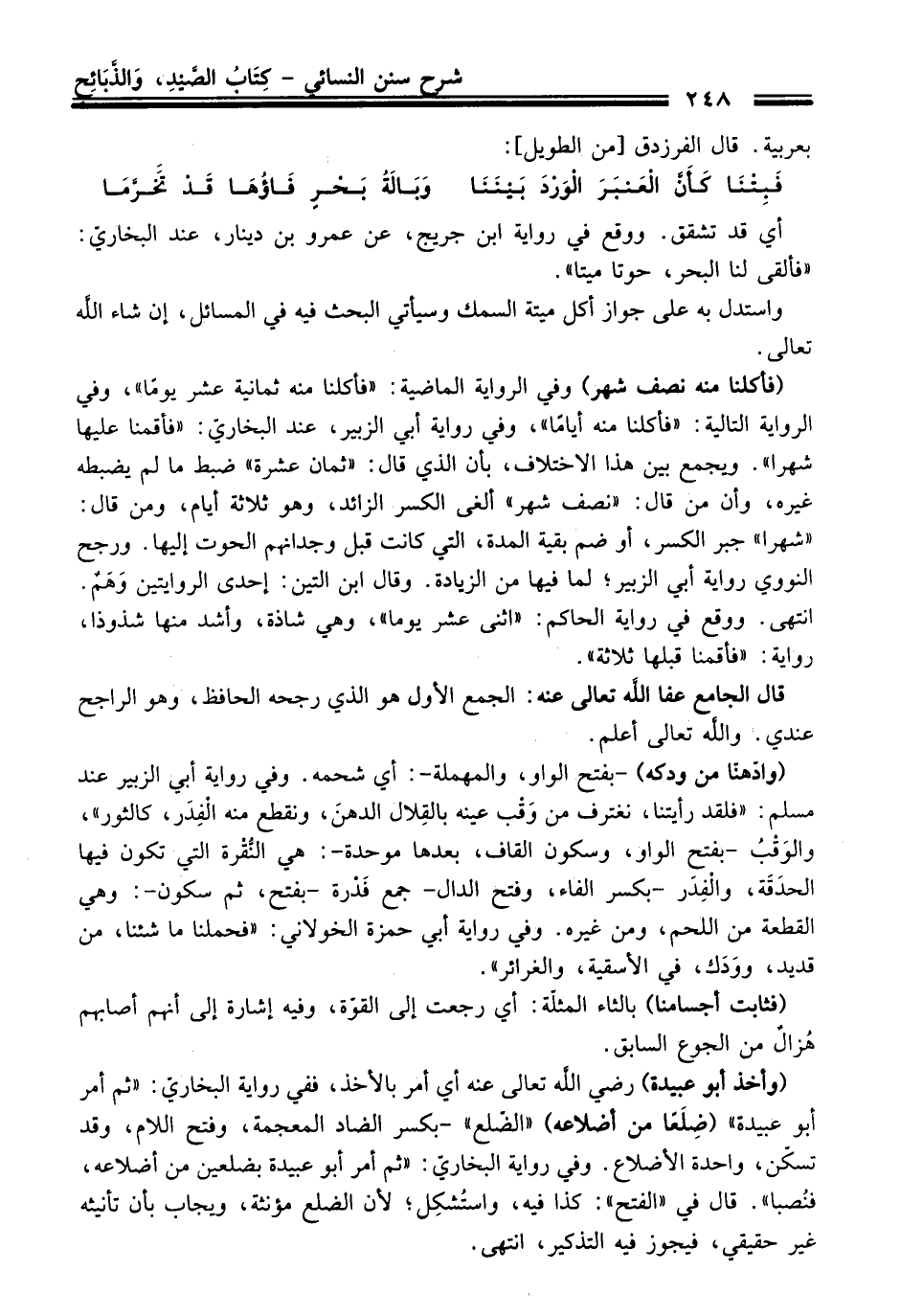 (فأكلنا منه نصف شهر) وفي الرواية الماضية: "فأكلنا منه ثمانية عشر يومًا"، وفي الرواية التالية: "فأكلنا منه أيامًا"، وفي رواية أبي الزبير، عند البخاريّ: "فأقمنا عليها شهرا". ويجمع بين هَذَا الاختلاف، بأن الذي قَالَ: "ثمان عشرة" ضبط ما لم يضبطه غيره، وأن منْ قَالَ: "نصف شهر" ألغى الكسر الزائد، وهو ثلاثة أيام، ومن قَالَ: "شهرا" جبر الكسر، أو ضم بقية المدة، التي كانت قبل وجدانهم الحوت إليها. ورجح النوويّ رواية أبي الزبير؛ لما فيها منْ الزيادة. وَقَالَ ابن التين: إحدى الروايتين وَهَمٌ. انتهى. ووقع فِي رواية الحاكم: "اثنى عشر يوما"، وهي شاذة، وأشد منها شذوذا، رواية: "فأقمنا قبلها ثلاثة".